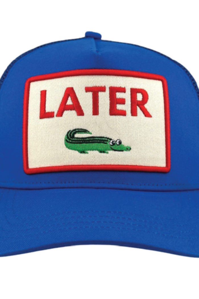 SEE YA LATER GATOR TRUCKER HAT HAS A 5 PANEL ADJUSTABLE SNAP. THIS ROYAL BLUE HAT IS SO FUN TO ADD TO YOUR OUTFIT.
