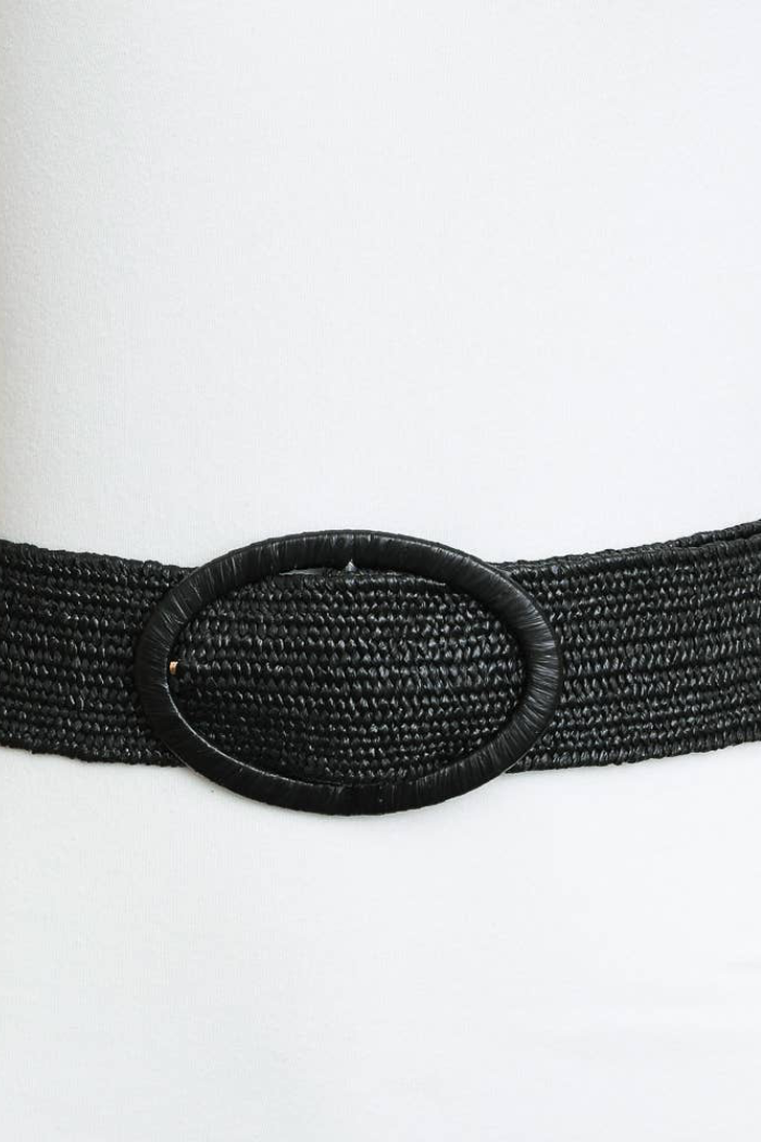 Raffia Oval Buckle Black Belt is a wide woven waist belt featuring a prominent oval buckle wrapped in matching raffia for a cohesive, textured look. The black finish gives it versatile, modern appeal while the elastic-like woven construction provides a comfortable fit at the waist. Leto Accessories offers this belt as a statement accessory to cinch dresses, tunics, and high-waist separates for a polished silhouette.