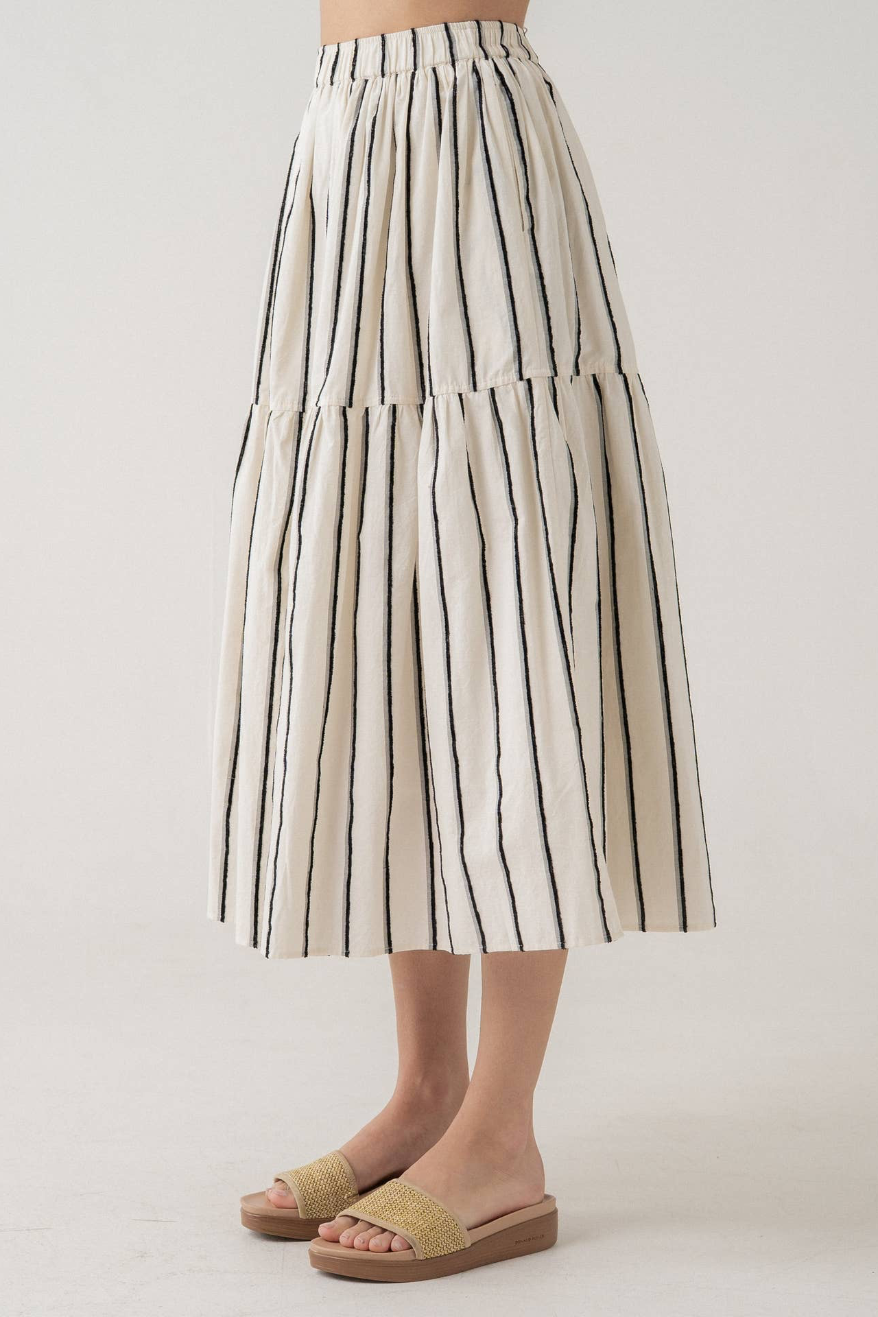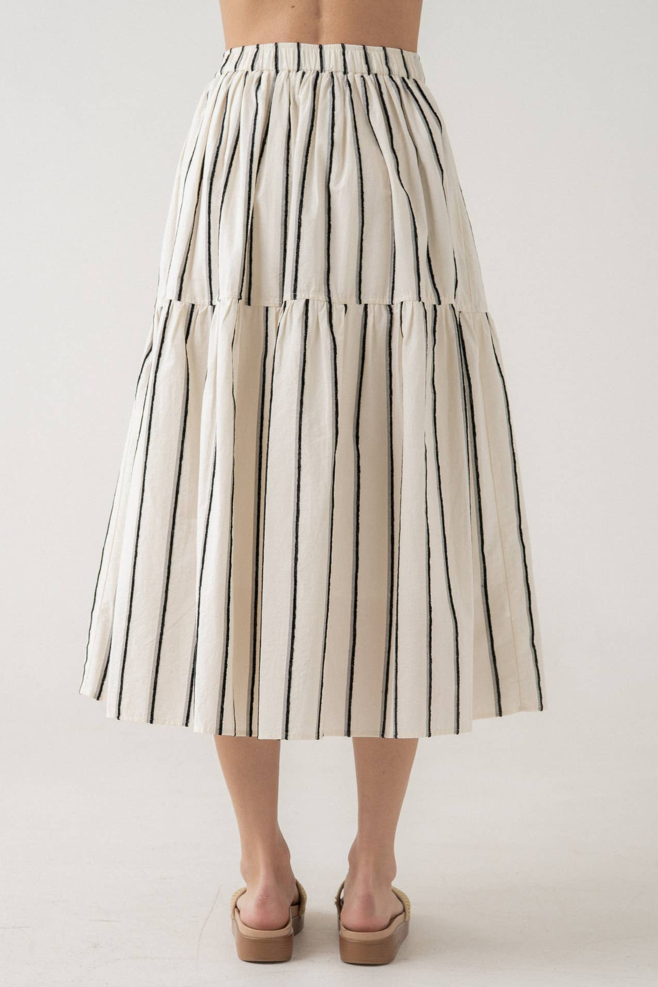 This tiered midi skirt has bold vertical stripes for a striking silhouette. Features an elastic waistband which offers pull-on ease and everyday comfort. Subtle gathered tiers create soft volume and movement, crisp texture balance structure with flow, also features a lining. This skirt is a sure statement piece that pairs effortlessly with basic or tucked knits. would go great with our ribbed tanks sold at moda boutique also, available in grey, white, black, all would look stunning with this skirt.