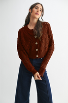 BEAUTIFUL KNIT CARDIGAN WITH GREAT WOVEN DETAIL THROUGHOUT. GOLD BUTTONS DOWN THE FRONT FOR CLOSURE. HAS A CROPPED FIT GREAT TO WEAR WITH WIDE LEG PANTS OR FLARE TO ACCENTUATE YOUR WAIST.
