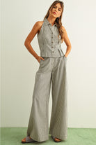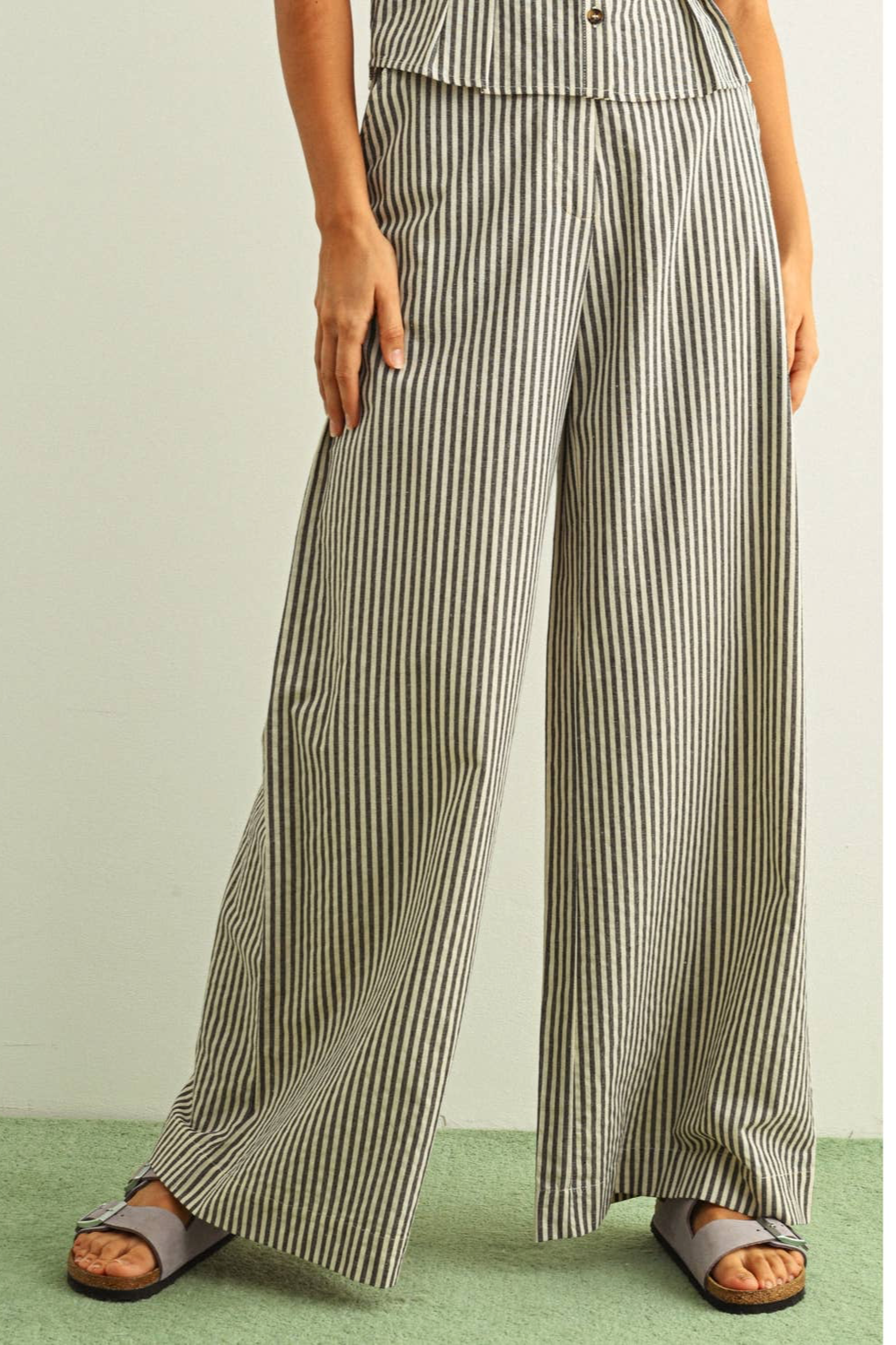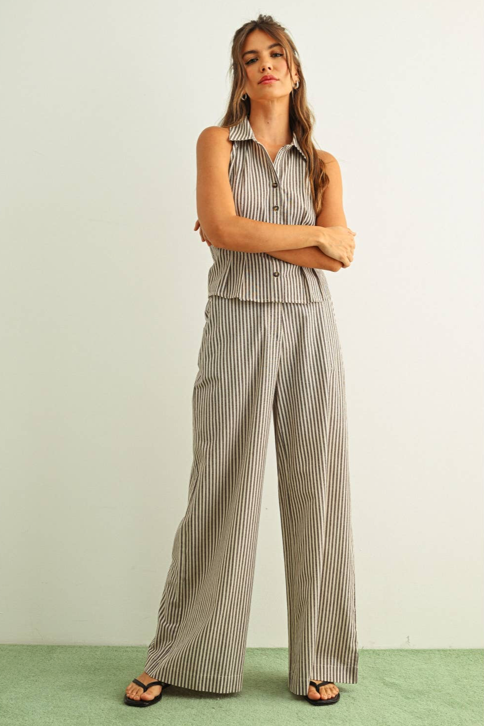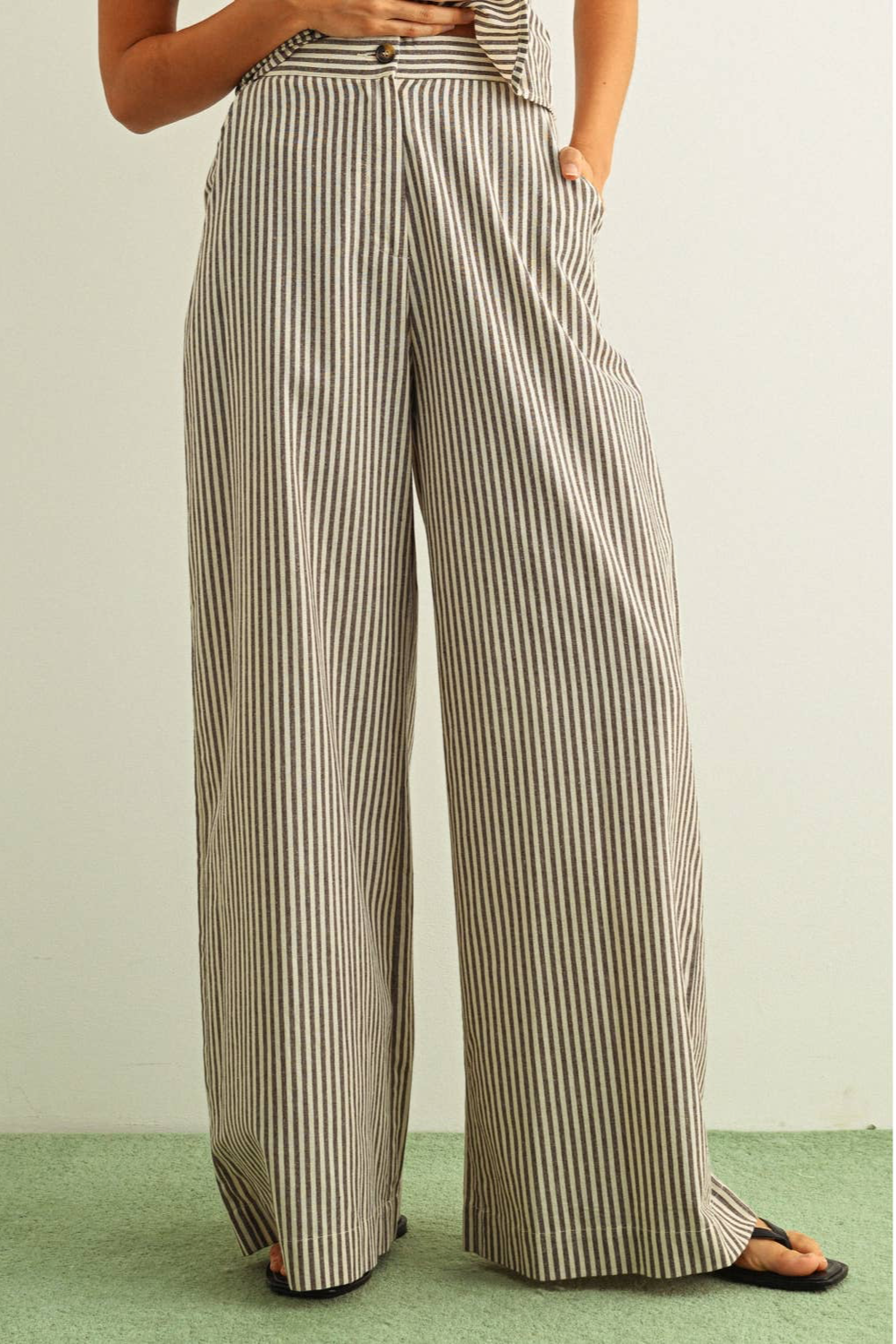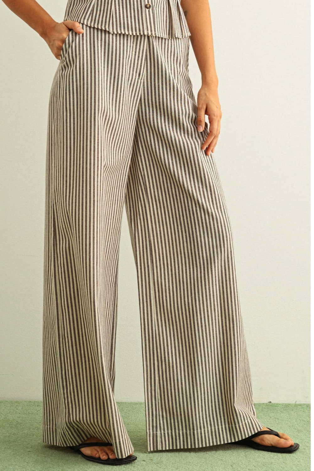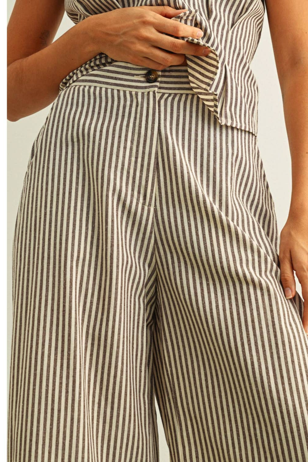 THESE COTTON STRIPED WIDE LEG TROUSER PANT WITH BROWN AND CREAM STRIPES HAVE A MATCHING TOP, ALSO SOLD AT THIS BOUTIQUE. THESE PANTS ARE ALSO GREAT ALONE WITH A TEE. IF BETWEEN SIZES YOU MAY WANT TO SIZE UP