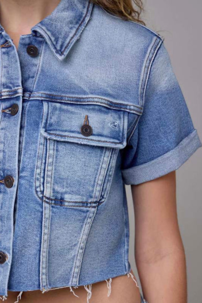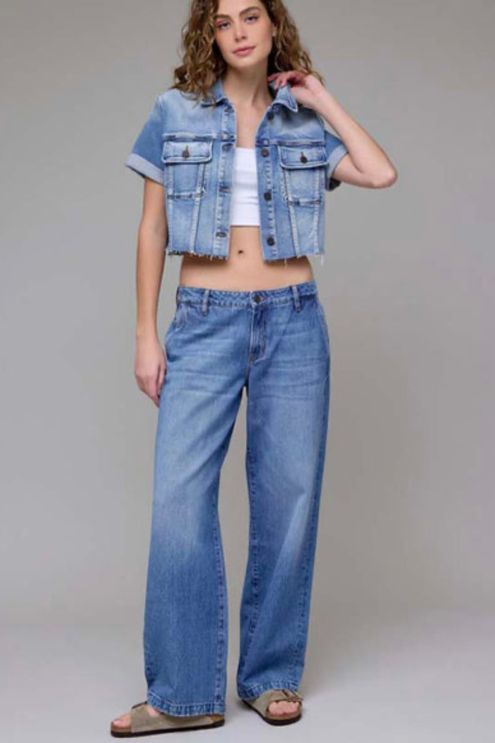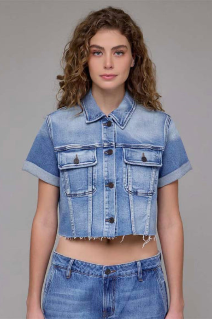 THIS DENIM JACKET IN MEDIUM WASH OFFERS A FLATTERING FIT WITH ITS CROPPED DESIGH AND FLEXIBLE STRETCH FABRIC. PERFECT FOR LAYERING, IT COMBINES CLASSIC DENIM STYLE WITH MODERN COMFORT, MAKING IT AN EASY CHOICE FOR EVERYDAY WEAR. ITS MEDIUM WASH ADDS A VERSATILE TOUCH THAT PAIRS WELL WITH A VARIETY OF OUTFITS.