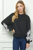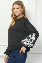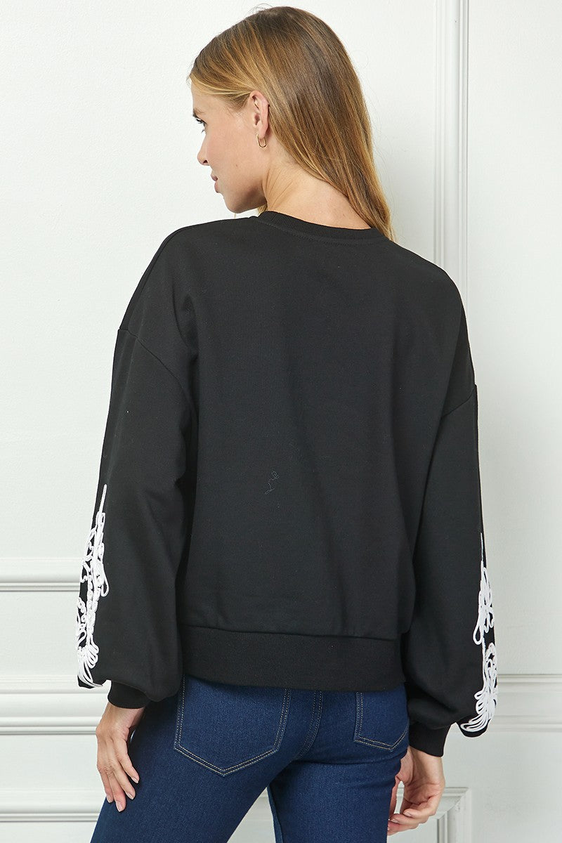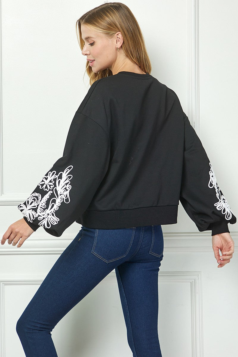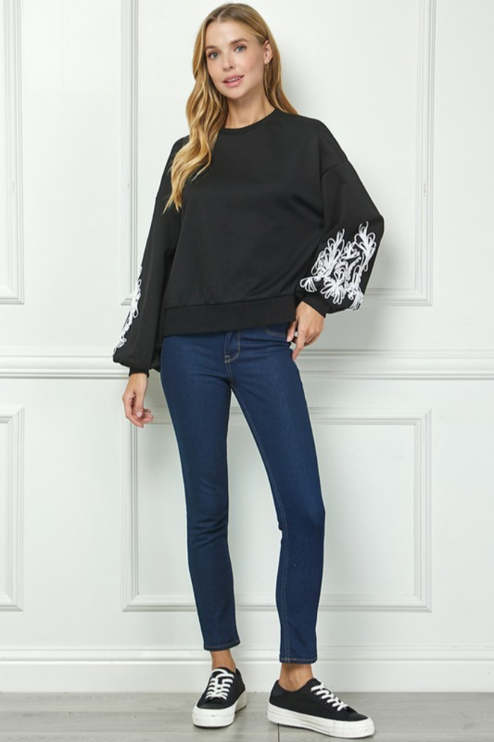 SIMPLE BUT SO DIFFERENT, SWEATSHIRT MATERIAL WITH WHITE WROPE EMBROIDERY FOR A BEAUTIFUL TOUCH. SLIGHT BALLOONING OF THE SLEEVES.BUST 22"LENGTH 25"
