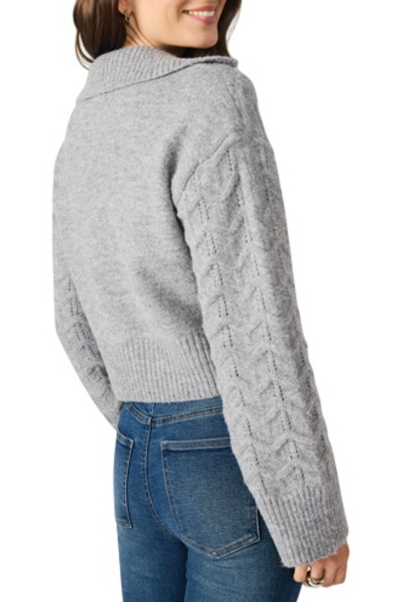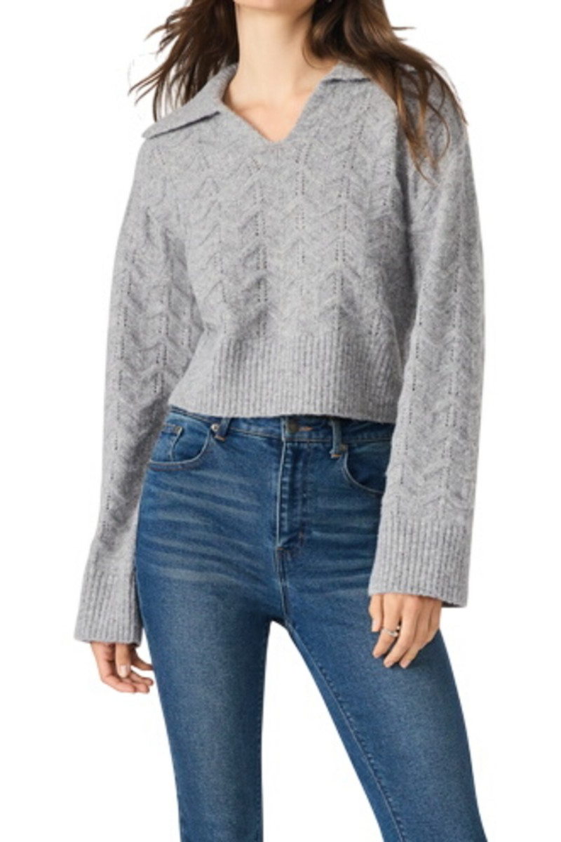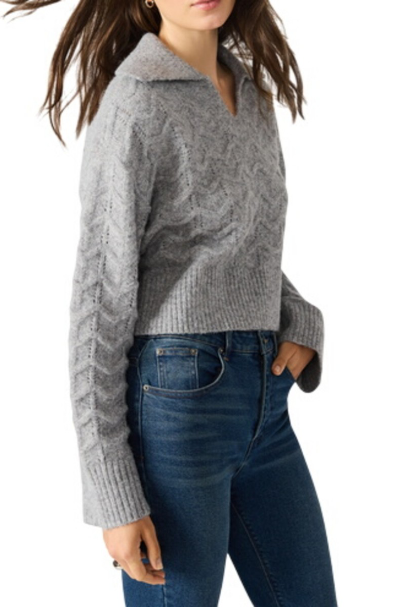 THIS SOFT GREY SWEATER HAS AN OVERSIZED COLLAR, SPLIT NECK, LONG SLEEVES, PULL OVER STYLE. TEXTURED KNIT FOR DRESSING UP OR DOWN. LOVE WITH BLACK LEATHER PANTS, OR SIMPLE JEANS.