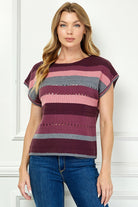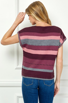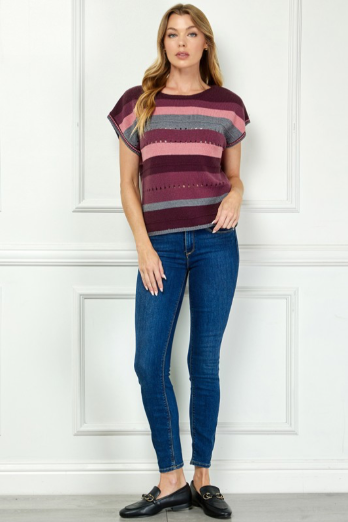 A CASUAL YET CHIC KNIT TOP FEATURING RICH BERRY ROSE, AND GREY TONES IN BOLD STRIPES. DESIGNED WITH A RELAXED SILHOUETTE, IT HAS DROP SHOULDERS SLEEVE, A ROUND NECKLINE,AND SUBTLE POINTELLE KNIT DETAILS ACROSS THE BODY THAT ADD TEXTURE AND BREATHABILITY. THE RIBBED HEMLINE AND SLEEVE EDGES OFFER A NEAT FINISH, MAKING THIS VERSATILE PIECE EASY TO STYLE WITH DENIM FOR A LAID-BACK LOOK OR TAILORED BOTTOMS FOR A MORE POLISHED VIBE.