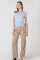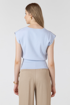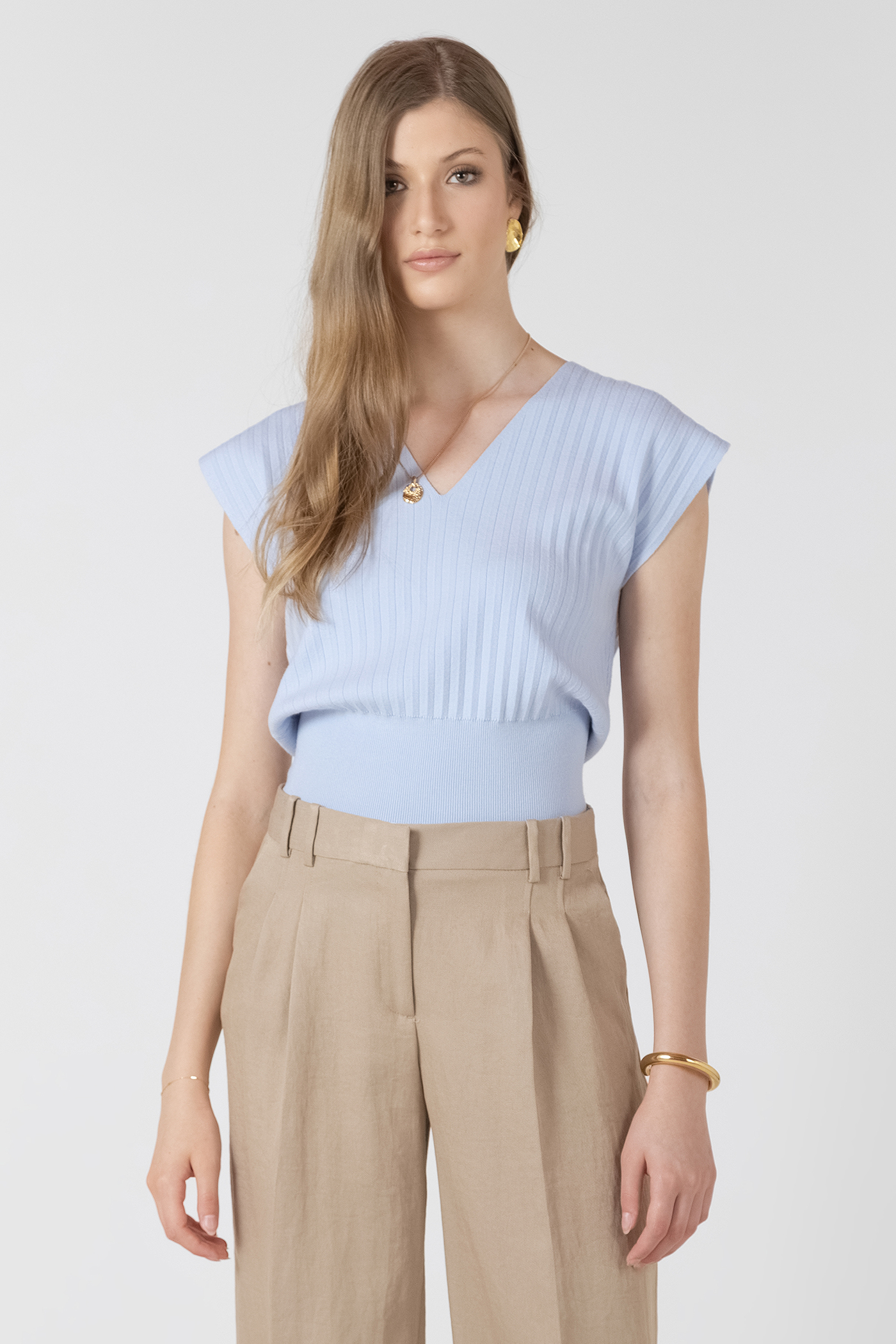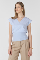 A lightweight ribbed knit with a flattering V-neckline, the Ribbed V-Neck Sweater Tank is a polished layering piece. It features a fitted wide waistband and cap-style sleeves that give a modern, waist-defining silhouette. Wear it alone for warm-weather workdays or layered under a blazer for a refined casual look.