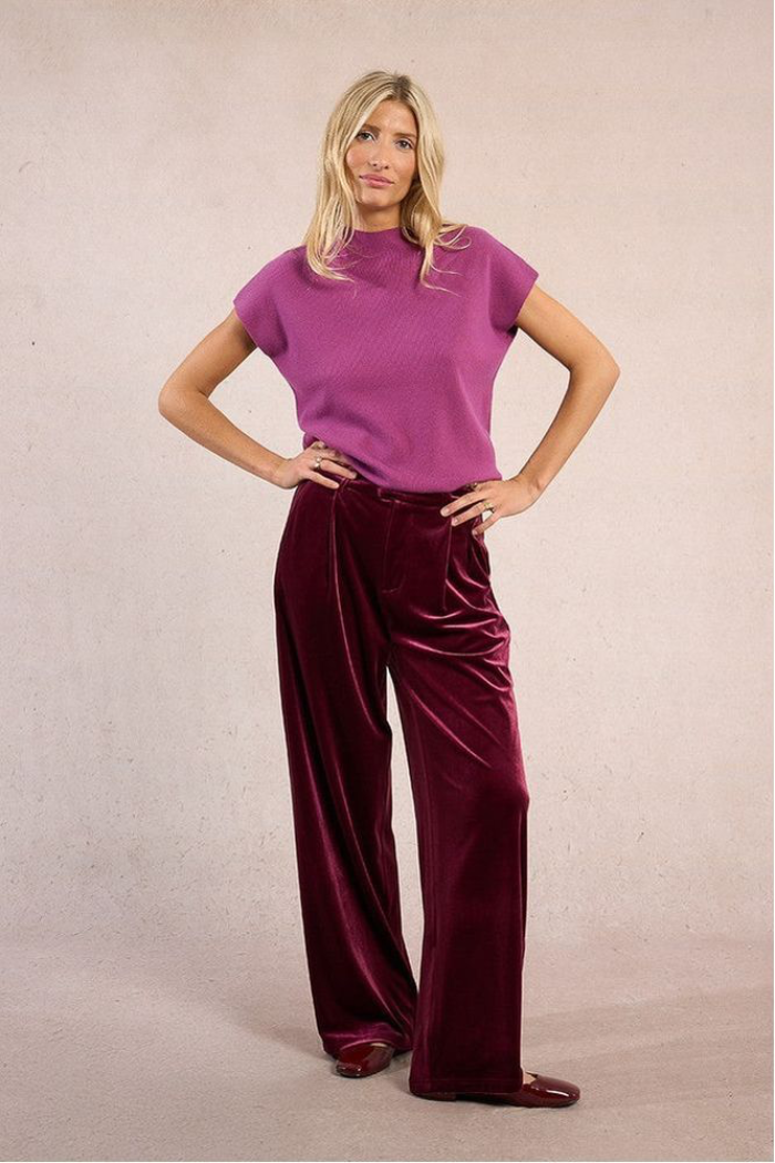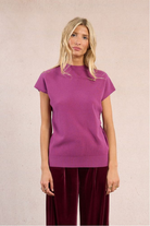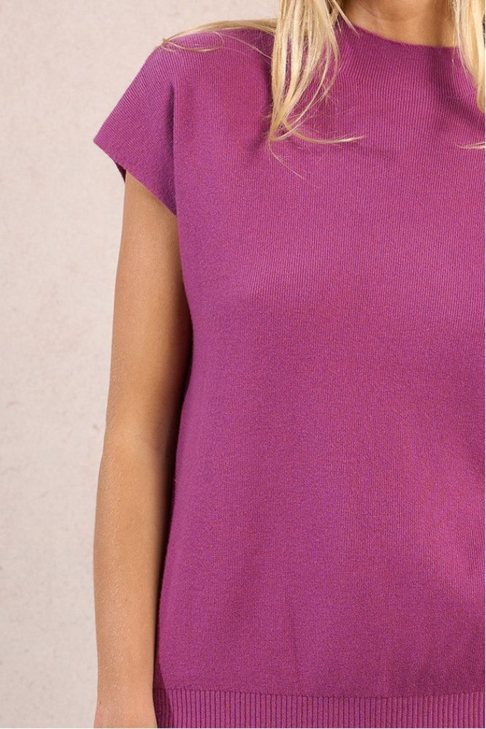 THIS PURPLE KNIT SWEATER COMBINES COMFORT AND STYLE WITH ITS STRAIGHT FIT AND DROOPED ARMHOLES, OFFERING A RELAXED YET FLATTERING SILHOUETTE. THE SHORT SLEEVES MAKE IT PERFECT FOR LAYERING OR WEARING ON MILDER DAYS, ADDING A VERSATILE PIECE TO YOUR WARDROBE