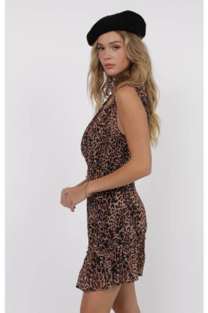 LIGHT WIEGHT, FUN MINI DRESS, SLEEVELESS WITH A RUFFLE CAP. HIGHER NECK WITH 2 BUTTON CLOSURE, AND ZIP. LITTLE PEAK A BOO DETAIL IN THE BACK FOR ADDED STYLE. HAS A BLACK ATTACHED SLIP UNDERNEATH. WEAR WITH A JEAN JACKED OR DRESS IT UP WITH A BLACK WRAP.MODEL IS 5'7 WEARING A SMALL