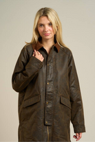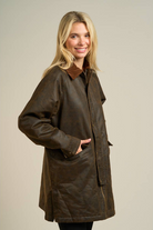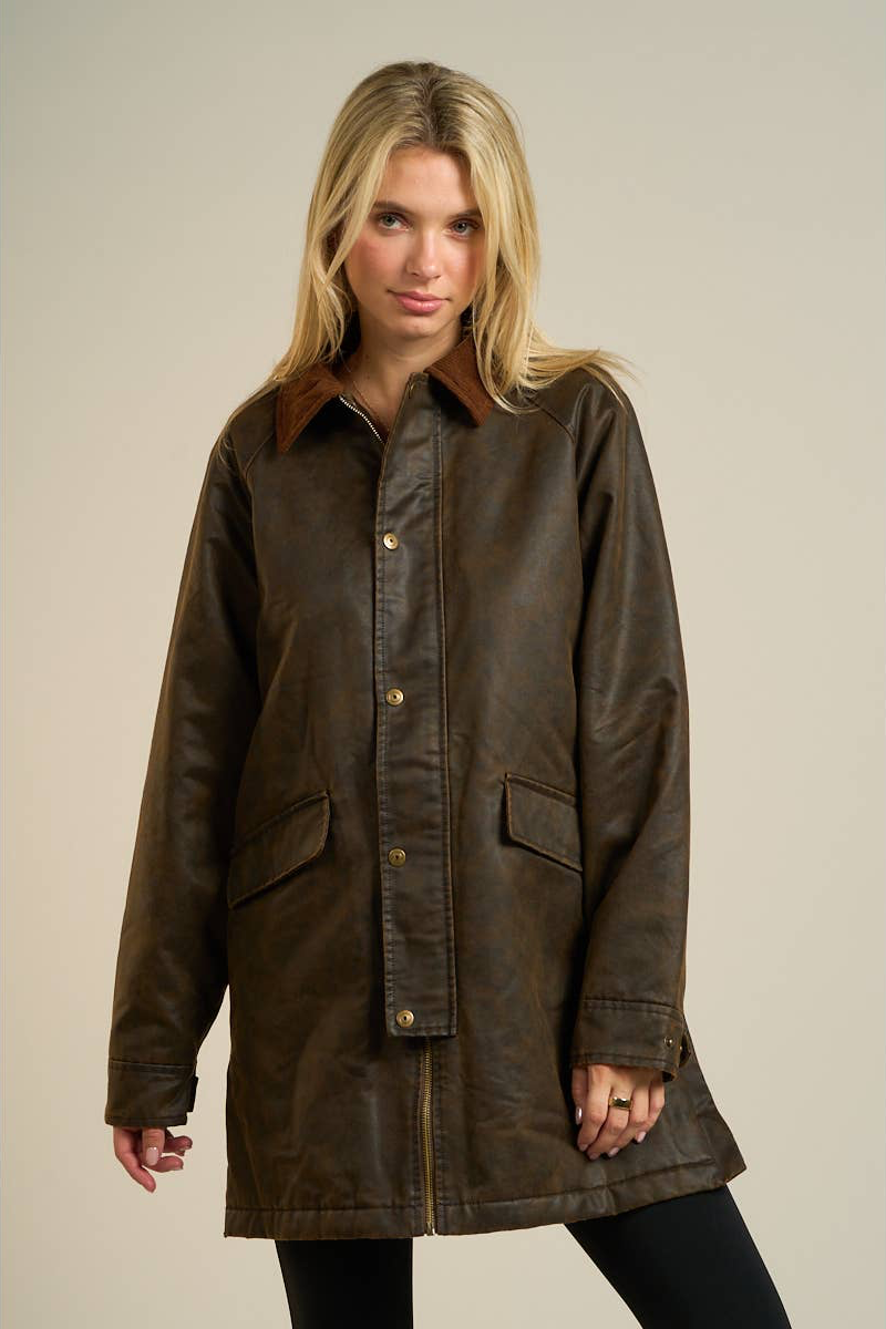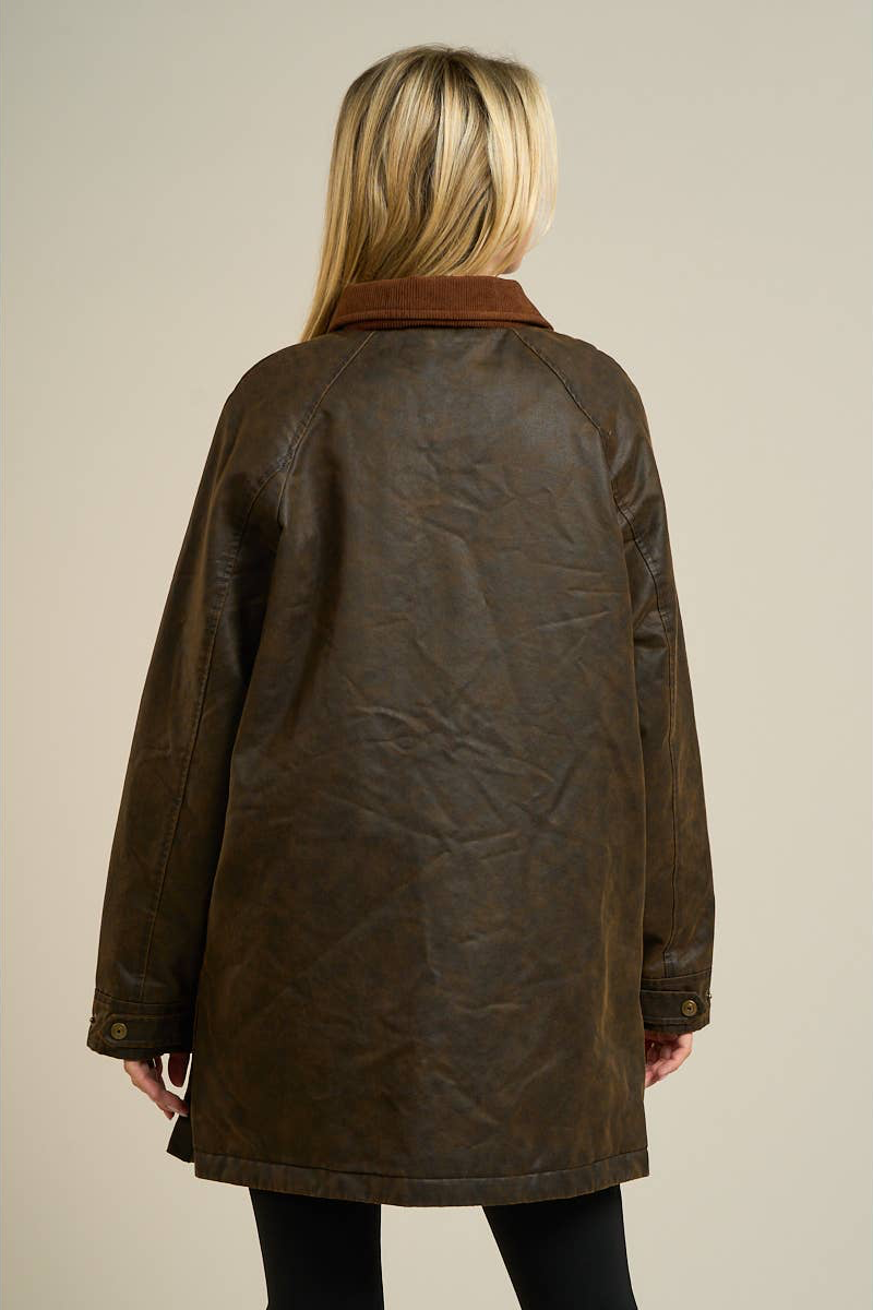 SUCH A TRENDY COAT FOR THE FALL. THIS EFFORTLESSLY CHIC, COZY COAT IS A TIMELESS WAXED UTILIY COAT. DESIGNED WITH A SOFT CORDUROY COLLAR, SNAP-BUTTON PLACKET, AND ROOMY FLAP POCKETS, IT OFFERS A LAID-BACK YET POLISHED LOOK. THE SLIGHTLY OVERSIZED FIT MAKES IT PERFECT FOR LAYERING OVER SWEATERS OR LIGHT KNITS, WHILE THE WATER-RESISTANT FINSIH KEEPS YOU PROTECTED IN THE LIGHT DRIZZLES. PAIR IT WITH DENIM, LEGGINGS, OR TAILORED TROUSERS FOR A EASY, OFF-DUTY VIBE