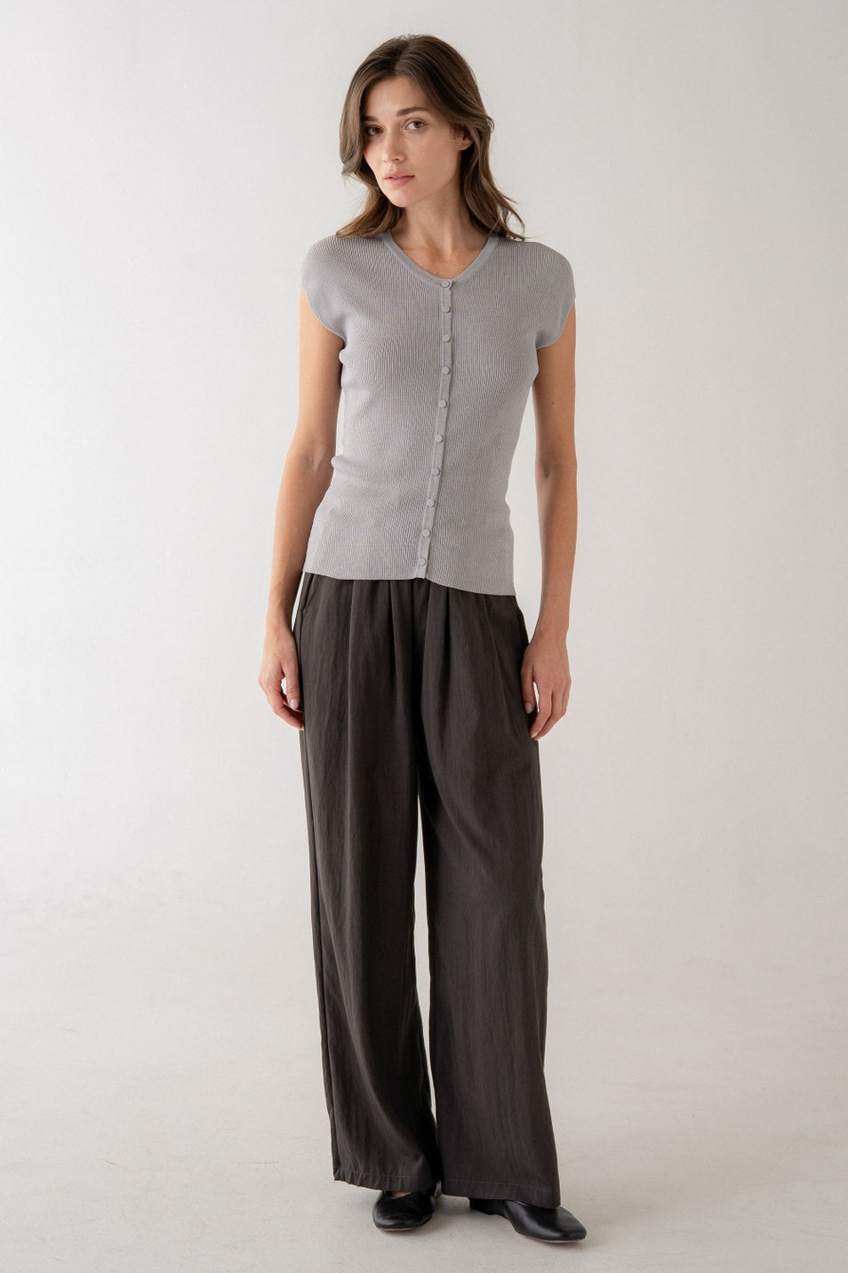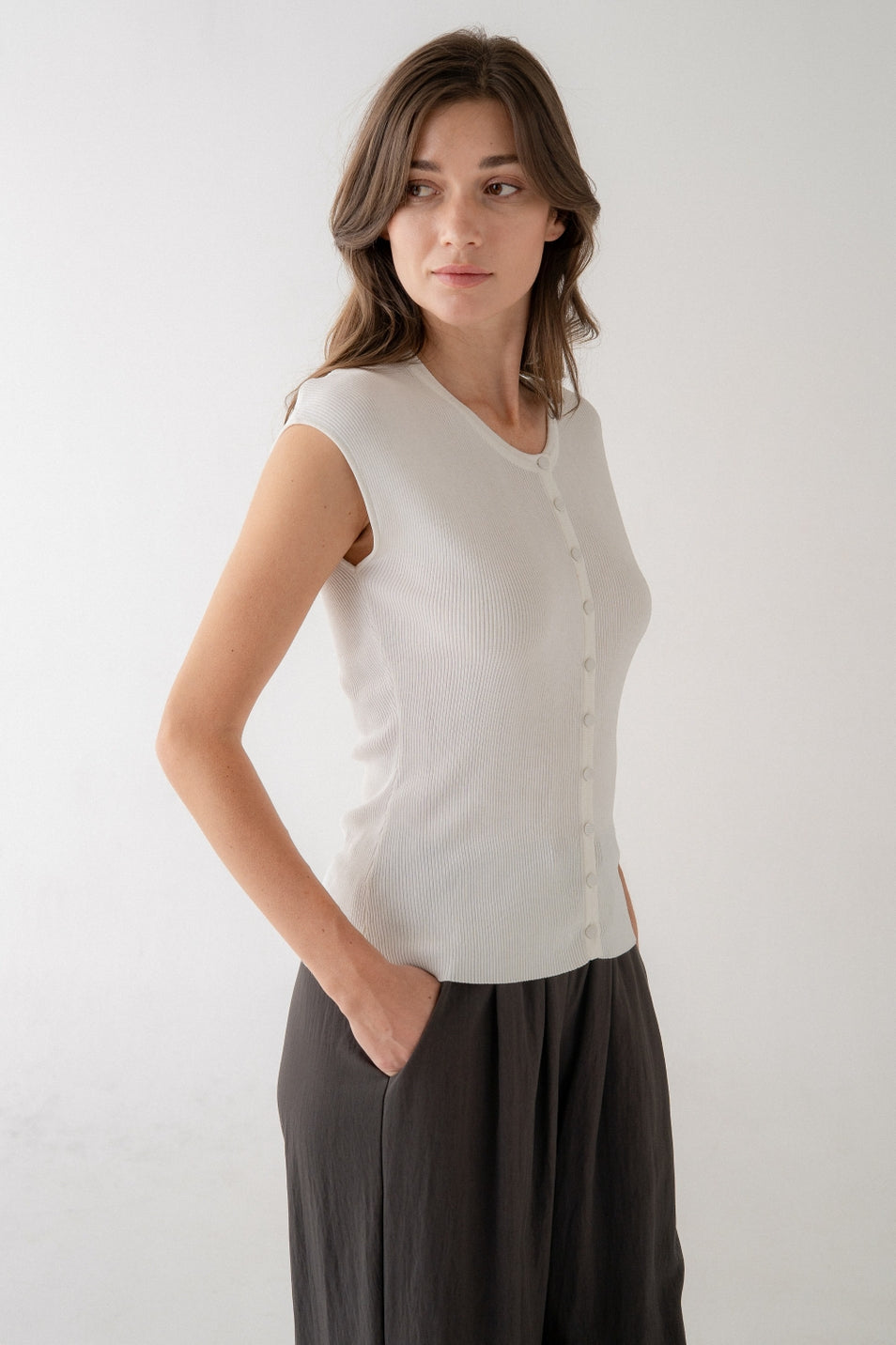 A lightweight ribbed tank with a close-fitting silhouette and a subtle crew-to-scoop neckline. The White Ribbed Tank from Elle Grey is sleeveless with a button-front detail and fine rib texture for everyday layering. Wear it solo in warm weather or under a blazer for a polished casual look. NOTE: THIS TOP IS WHITE, SHOWN IN GREY FOR DETAIL.