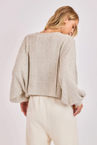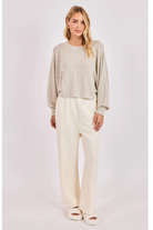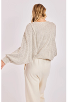 SOFT GREY AND IVORY TON TOP FOR AN EVERYDAY EFFORTLESS LOOK. THE STIPPING DESIGN GIVES SUCH STYLISH DETAIL. TIGHTER FIT AROUND WAIST, AND WRIST.