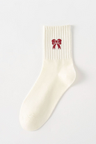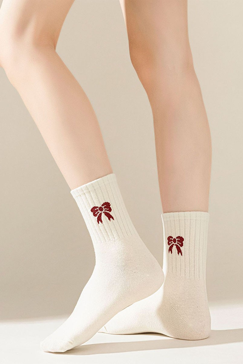 ADD A LITTLE HOLIDAY TO YOU OUTFIT. THESE CHRISTMAS RED BOW SOCKS HIT MID-CALF FOR A COMFORTABLE FIT.