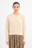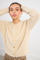 A SWEET SWEATER TO WEAR ALONE OR LAYER. THIS CARDIGAN IS A TEXTURED KNIT, HAS LONG SLEEVES AND SIMPLE GOLD BUTTON CLOSURE. RIBBED FINISH ON THE NECKLINE, CUFFS AND HEM.