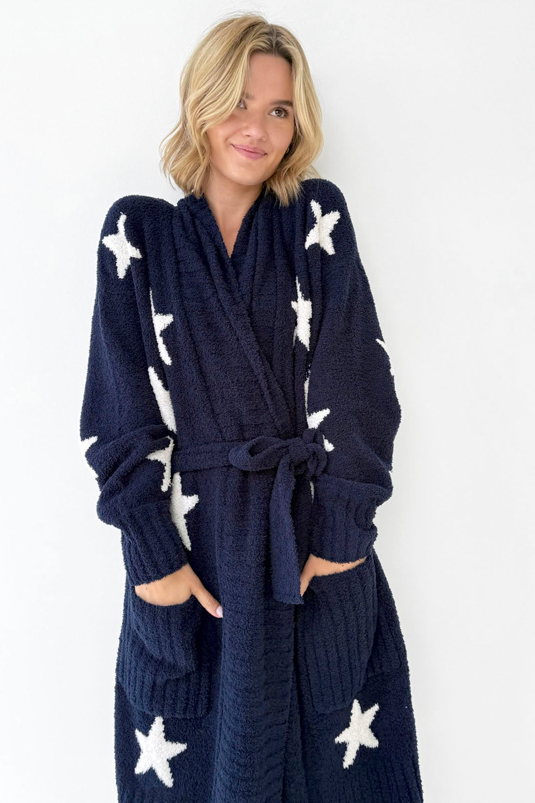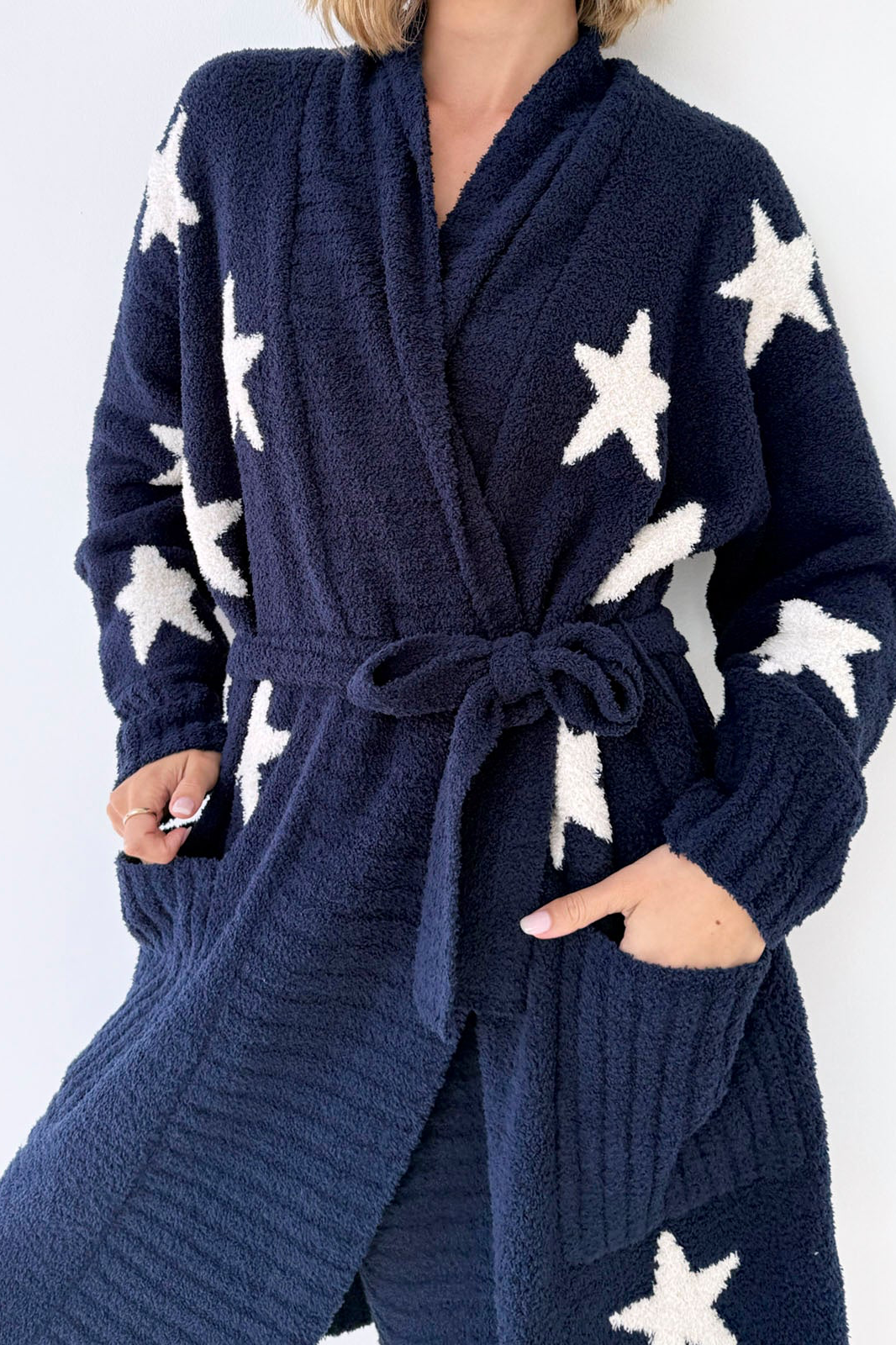 WRAP UP IN THE PLUSH SOFTNESS OF THR POMONA FUZZY YARN ROBE. CRAFTED FROM A FUZZY CHENILLE YARN, IT OFFERS A CHUNKY-COZY TEXTURE THAT KEEPS YOU WARM FROM LAZY MORNINGS TO COZY NIGHTS. THIS SOFT PIECE FEATURES RIBBED DETAILING, ROOMY POCKETS AND SELF-TIE BELT FOR A CUSTOMIZABLE FIT. MODA BOUTIQUE ALSO HAS THE MATCHING STAR SOCKS.