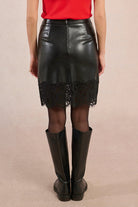 BEST SKIRT EVER. THIS FITTED SHORT SKIRT HAS A TOUCH OF SEMI-SHEER LACE AT THE BOTTOM FOR ADDED DETAIL. HIGH WAISTED, SYNTHETIC LEATHER, INVISIBLE ZIP CLOSURE, STRAIGHT FIT. GREAT WITH HEALS OR BOOTS.