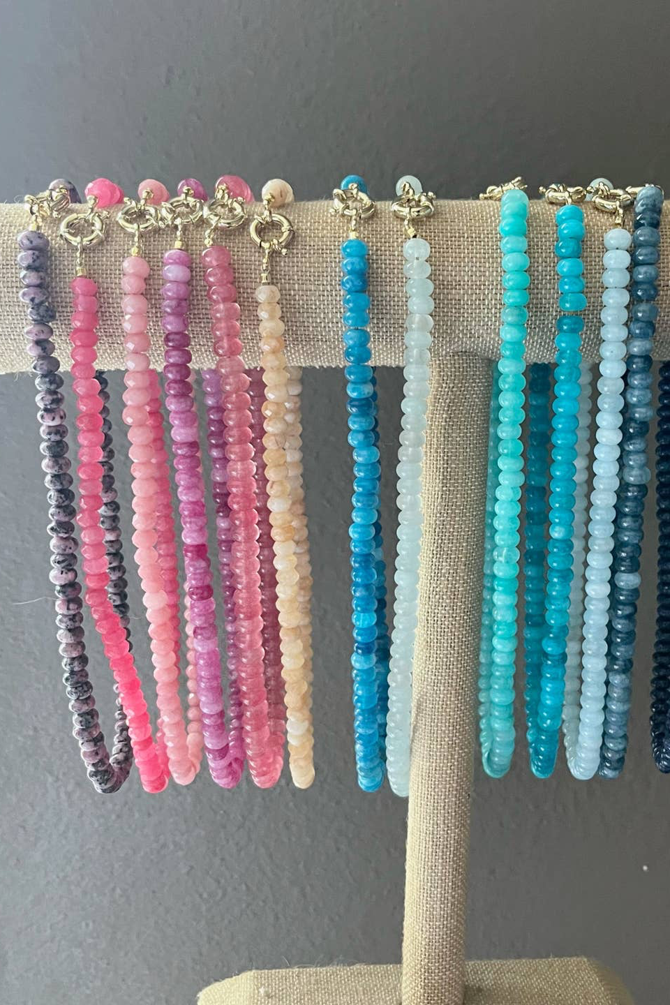 ADD A POP OF COLOR TO ANY OUTFIT. HANDMADE IN SOUTH CAROLINA WITH GEMSTONE BEADS AND 18KT PLATED GOLD CLASP. PERFECT TO PAIR WITH CHARMS ON THE CLASP, A PENDENT OR CHARM ON THE FRONT, LAYERED OR ALONE.