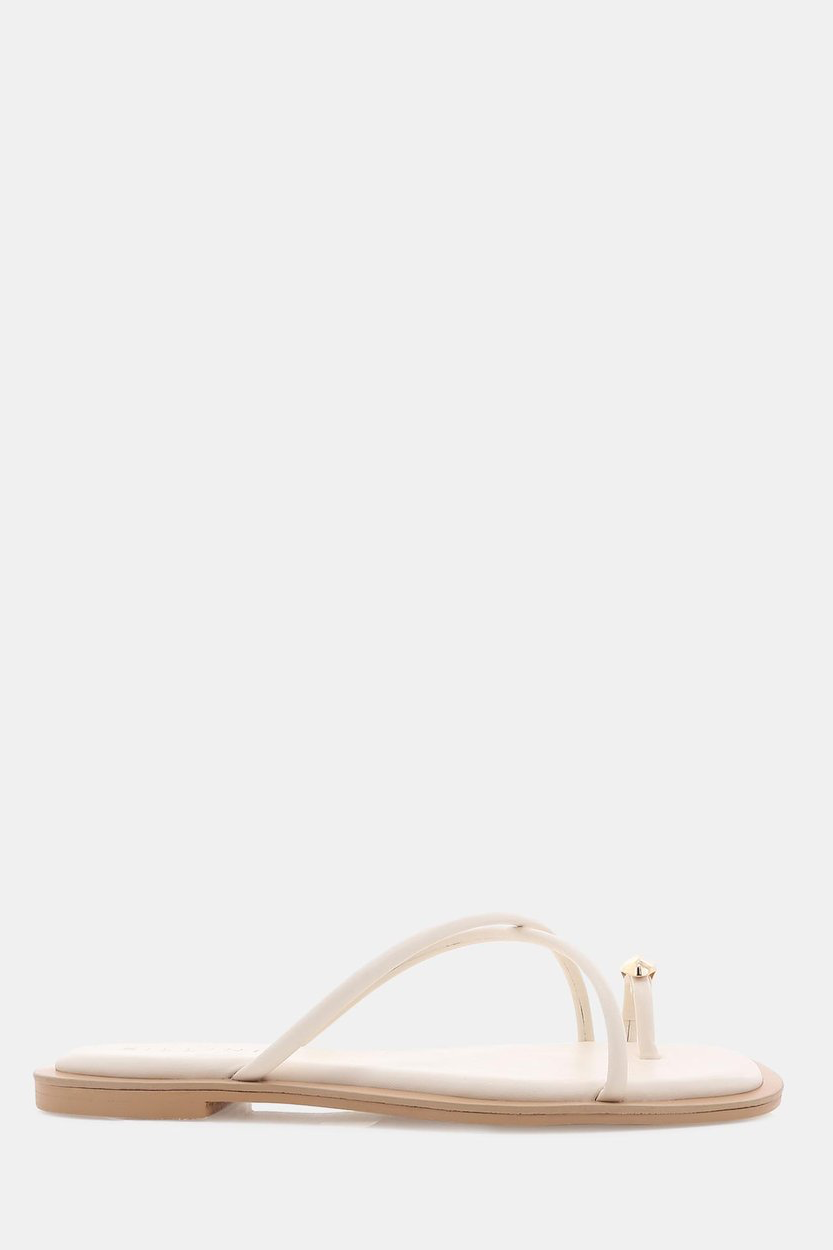 The Padded Toe-Loop Flip Flop Sandal is a minimalist thong sandal with a cushioned footbed and slender straps for an elevated casual look. It’s crafted in smooth vegan leather with a subtle gold-tone accent at the toe loop. The square-toe silhouette and low-profile sole keep the style relaxed and easy to wear for warm-weather days. Pair it with denim or breezy dresses for an off-duty, beach-ready outfit.