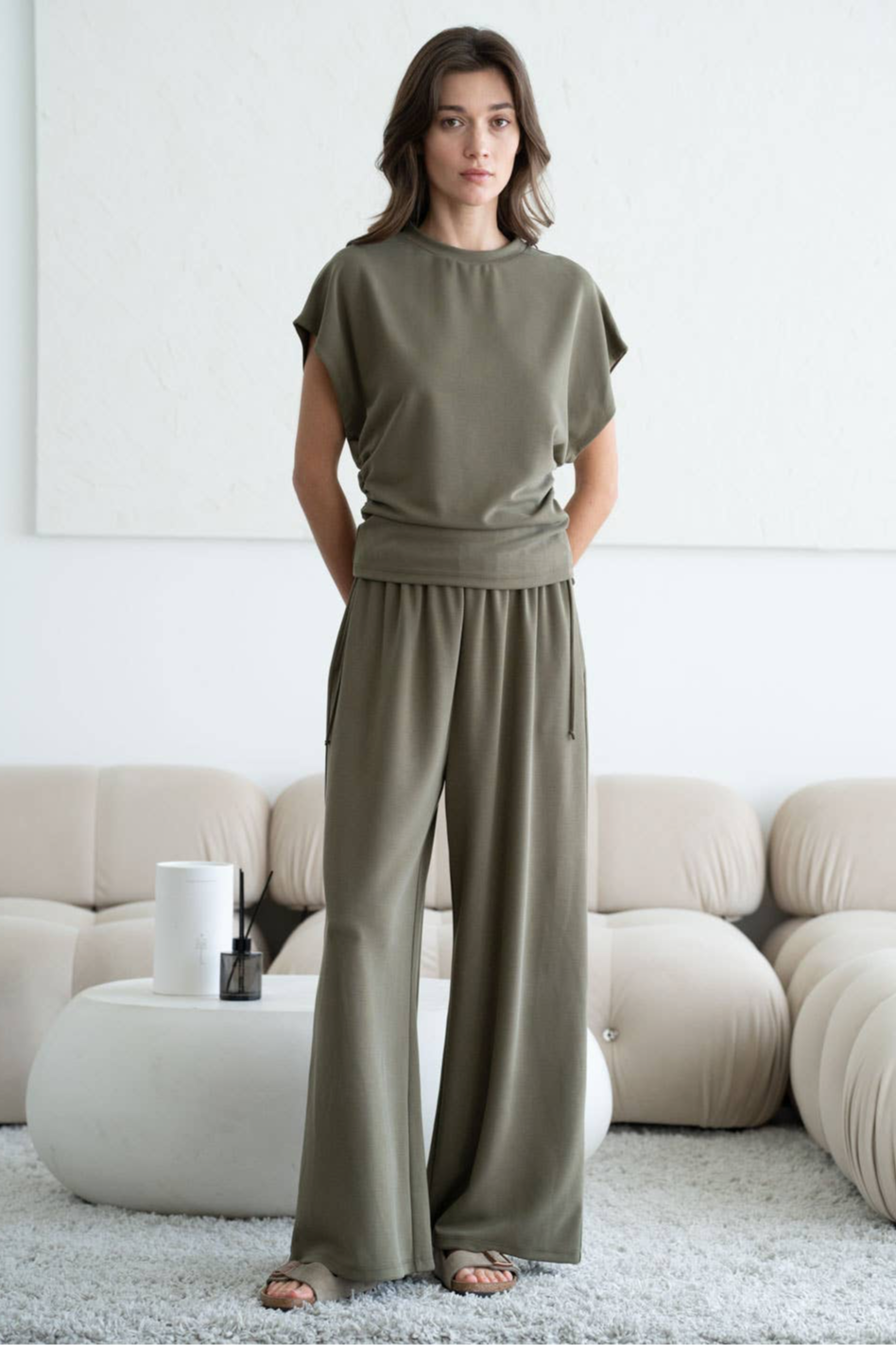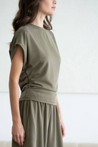 THIS TOP HAS A RELAXED CAP SLEEVE SILHOUETTE, SOFT DRAPED BLEND JERSEY MATERIAL. THE SIDE GATHERS CREATE FLATTERING SHAPE AT THE WAIST. A GREAT WIDE HEM BAND FOR A CLEAN, STRUCTURED FINISH. THIS TOP PAIRS EFFORTLESSLY WITH A SKIRT OR MATCHING WIDE-LEG PANTS ALOS AVAILABLE AT MODA