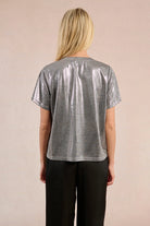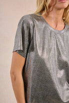 BEAUTIFUL FUN IRIDESCENT SILVER KNIT TEE, FOR THE HOLIDAYS OR JUST ADD SPICE TO YOUR OUTFIT. STYLE IS STRAIGHT AND SHORT CUT, SHORT SLEEVES, WITH A ROUND NECKLINE.