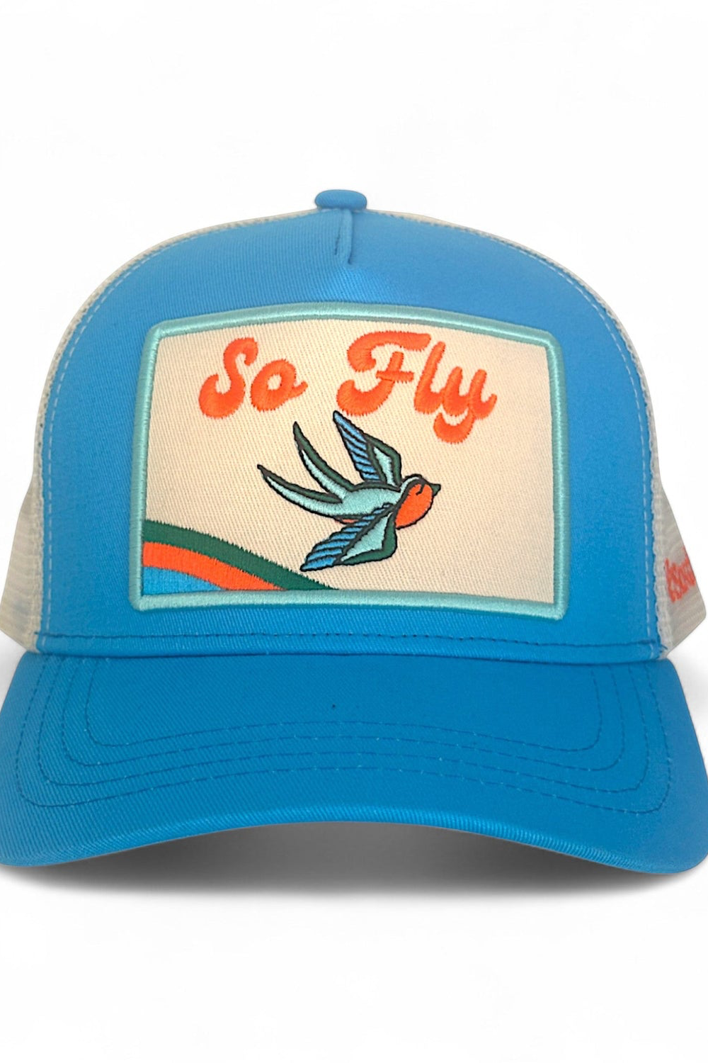 A classic trucker cap with a bright embroidered “So Fly” patch and retro swallow motif, built for warm-weather wear. The SO FLY Trucker Hat features a structured foam front, curved visor and breathable mesh back with an adjustable snap closure for a custom fit. This playful colorblocking and stitched detailing give it a vintage-casual vibe that dresses up tees and denim alike. Lightweight and packable, it’s an easy go-to for beach days and weekend adventures. The back mesh of this hat is cream to match cream patch on front.