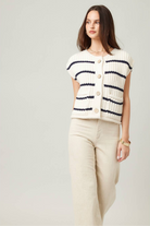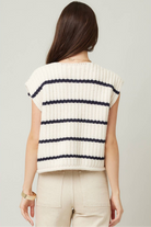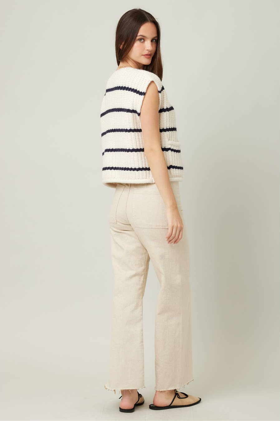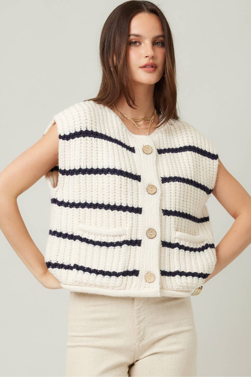 PERFECT FALL SWEATER VEST. BLUE/IVORY STRIPE BUTTONS DOWN FRONT. THIS SLEEVELESS VEST IS GREAT WORN ALONE BUT ALSO PERFECT WITH A TURTLE NECK FOR EXTRA WARMTH. ALSO SUPER CUTE PATCH POCKET DETAIL.