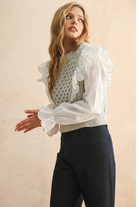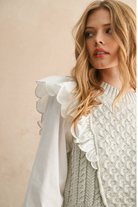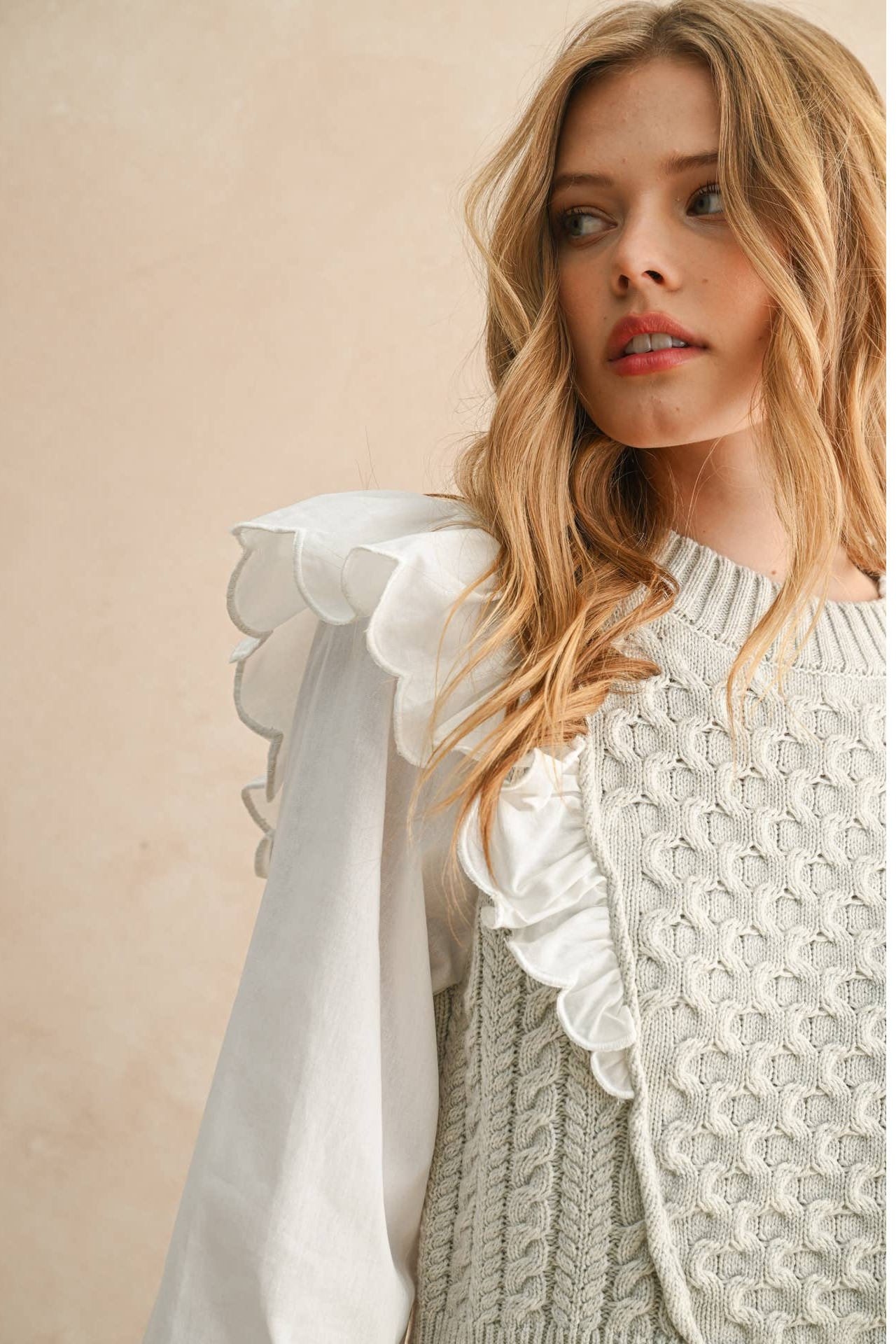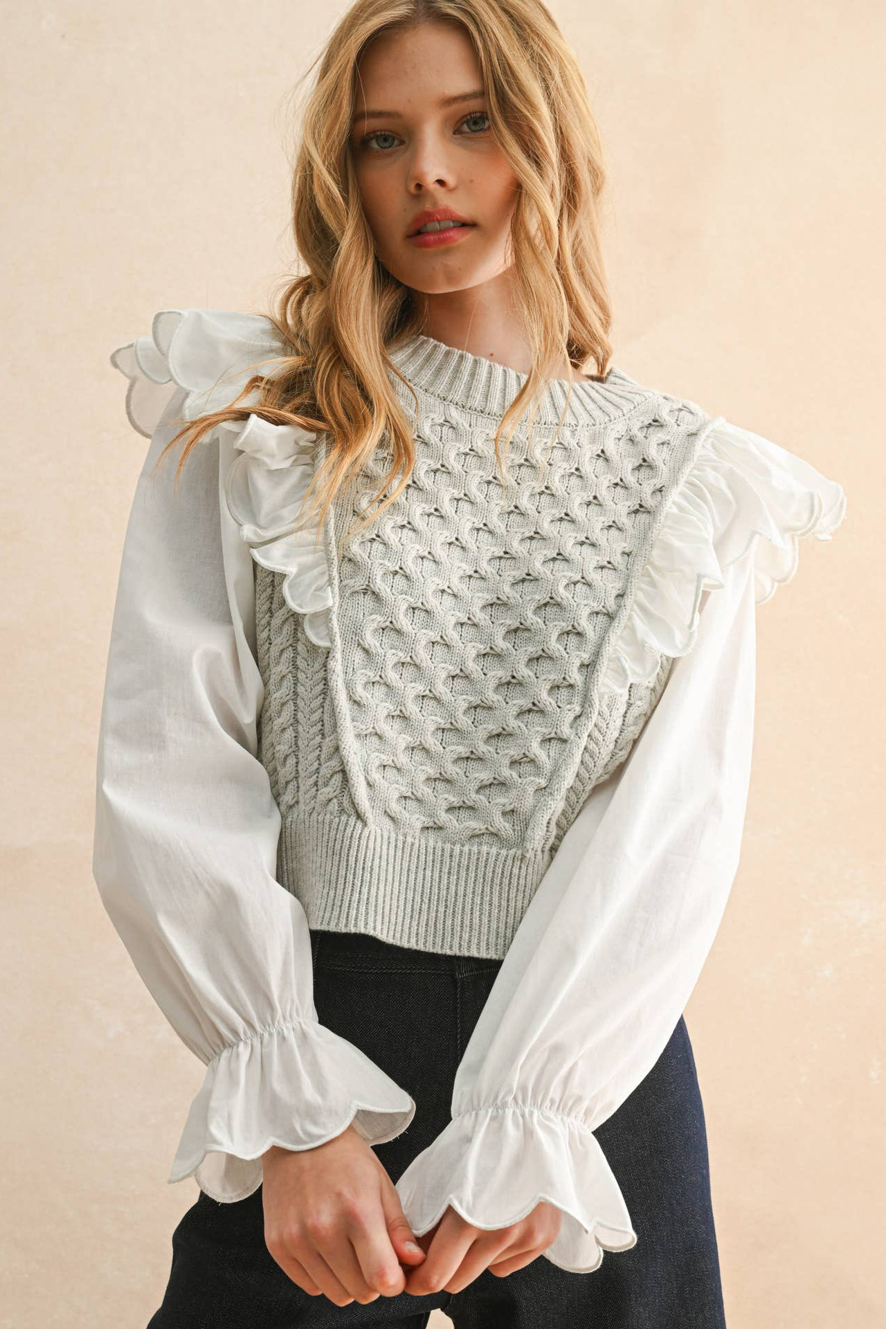 SWEAT SWEATER FOR THE START OF SPRING. A BUILT IN RUFFLE BLOUSE ADDS SUCH NICE DETAIL TO THE LIGHT GREY CROPPED SWEATER.