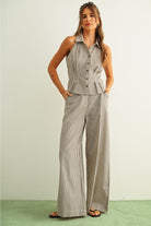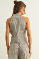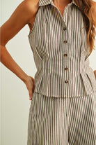 CINCHED WAIST PLEATED STRIPED BLOUSE WITH COLLAR. GREAT WITH A SKIRT, JEANS OR THE MATCHING BOTTOMS, ALSO SOLD AT THIS BOUTIQUE.