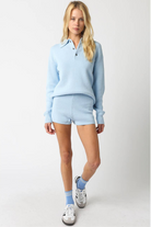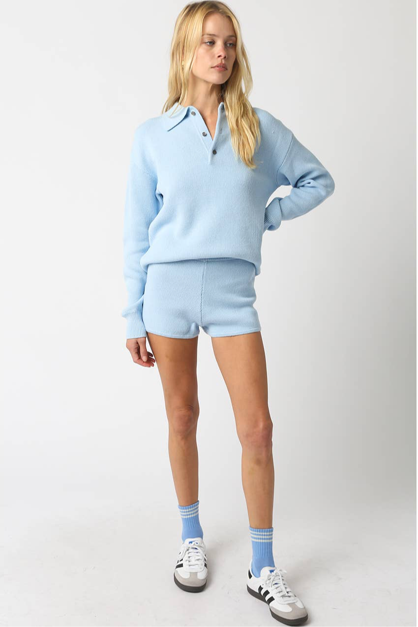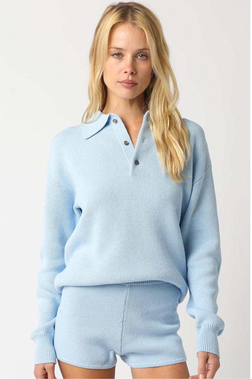 A soft knit pullover with a short button placket and relaxed silhouette, perfect for casual days. The Cailyn Knit Top in blue features a shirt collar, long sleeves and a textured sweater knit that layers easily. This top was designed for cozy at-home lounging or effortless weekend wear.