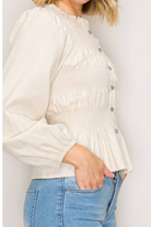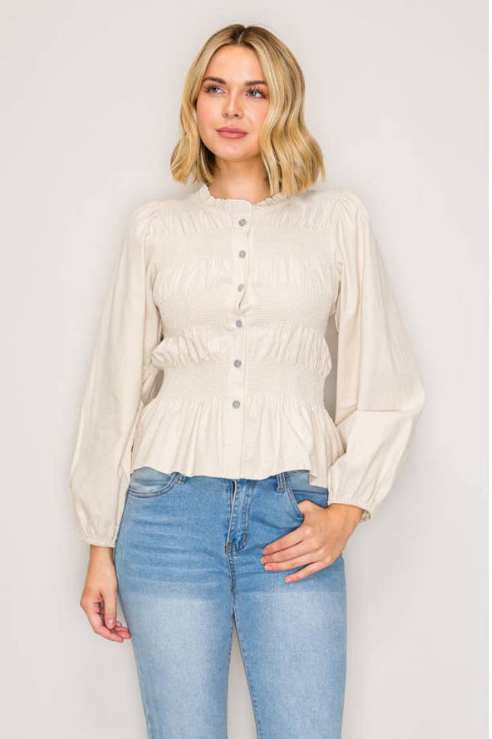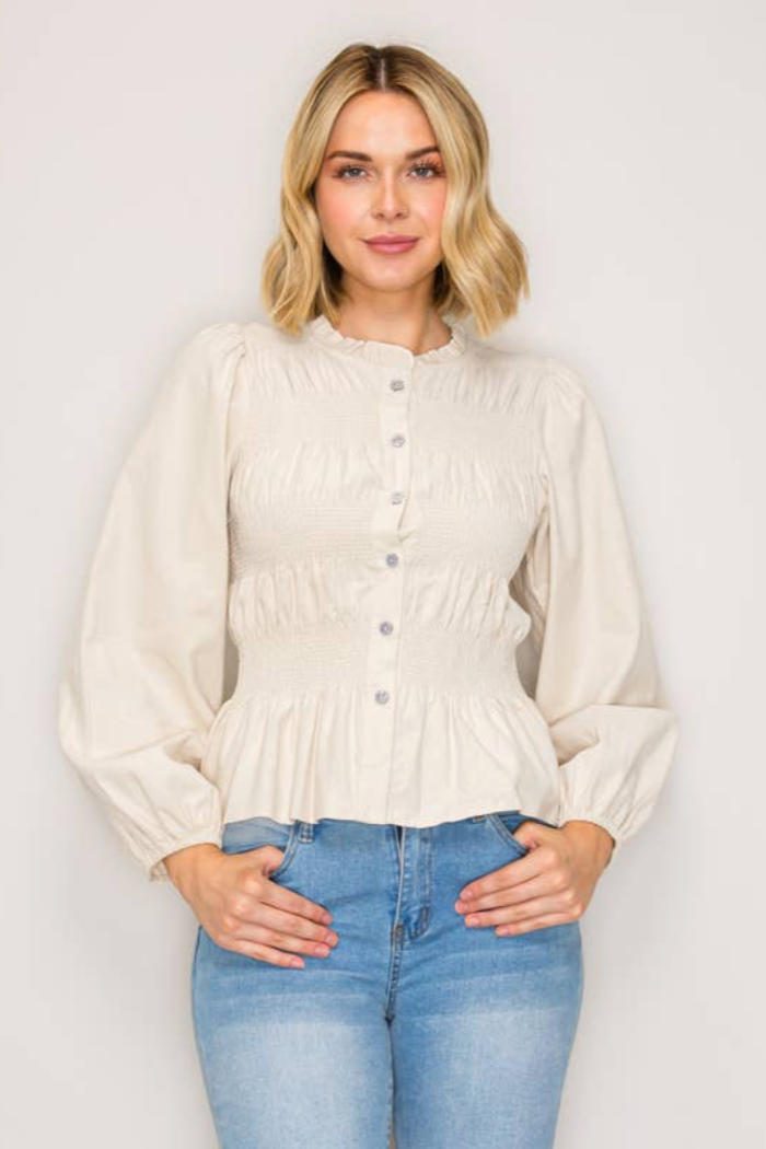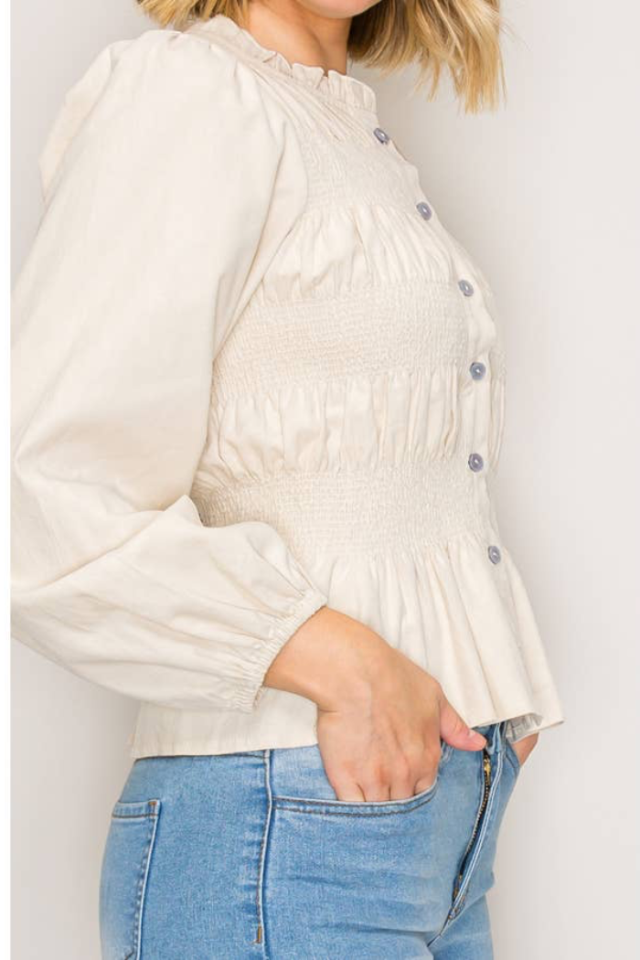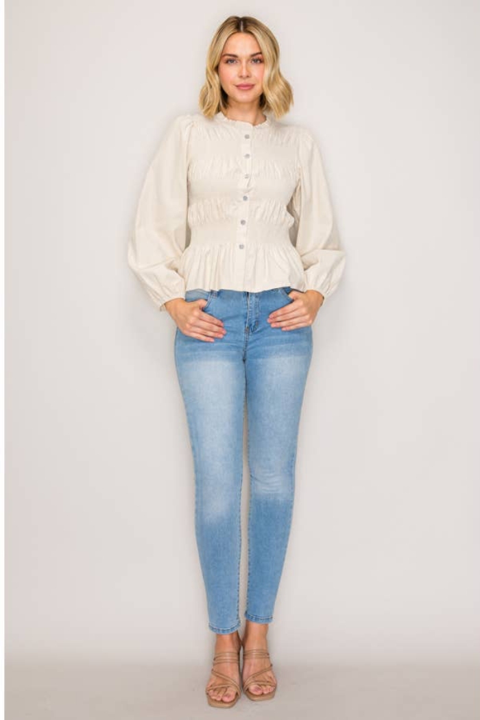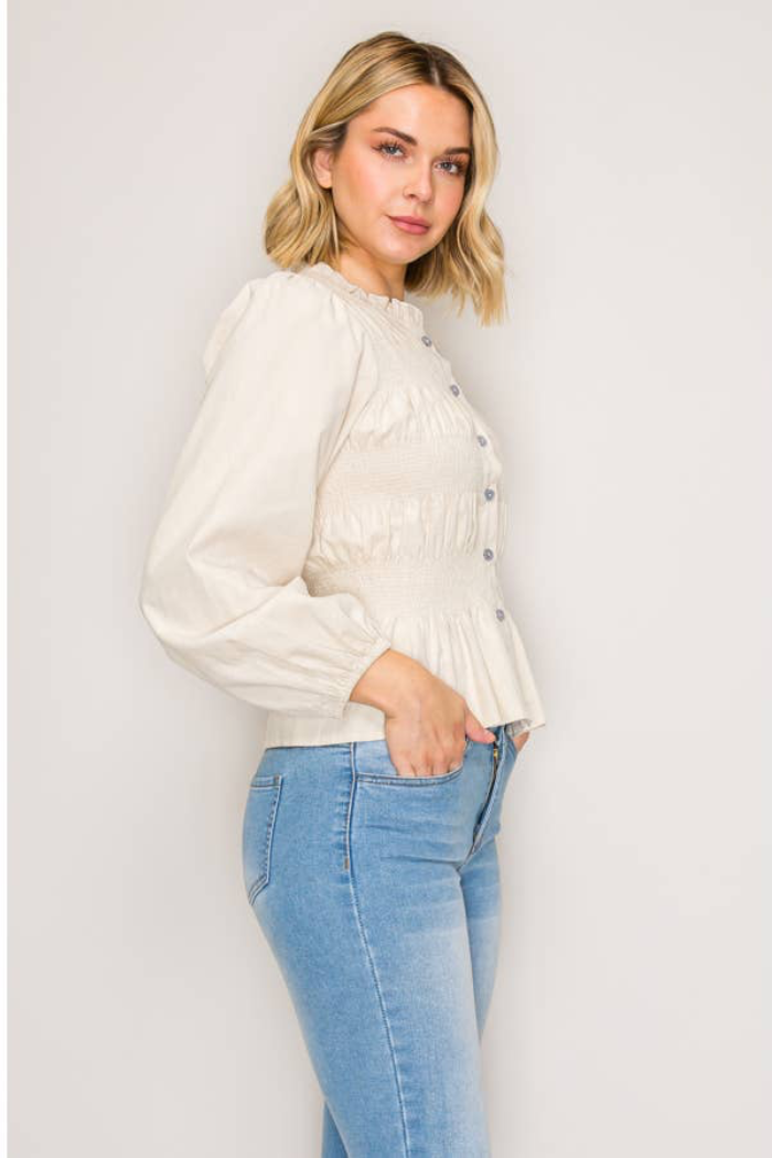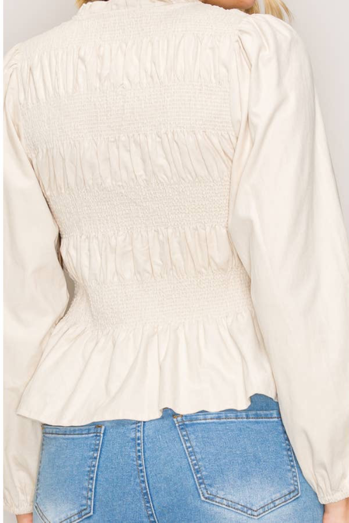 A lightweight, gathered button-front top with a softly ruffled high neckline and a fitted, smocked waist. The SHAYLA BLOUSE pairs delicate peplum shaping with billowy long sleeves for an effortless, feminine look. Wear it casually with denim or dressed up for the office with tailored trousers.
