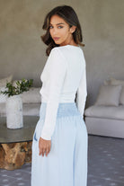 The White Tie Front Top is a cropped, tie-front sweater-style top with a plunging V-neck and long sleeves. It’s crafted in a lightweight knit that ties at the waist for a breezy, flattering silhouette ideal for warm-weather styling. This piece is designed to feel both casual and a little flirty, making it perfect for daytime outings or a date night paired with high-waist bottoms. Great as a bathing suit coverup as well, to be vacation ready