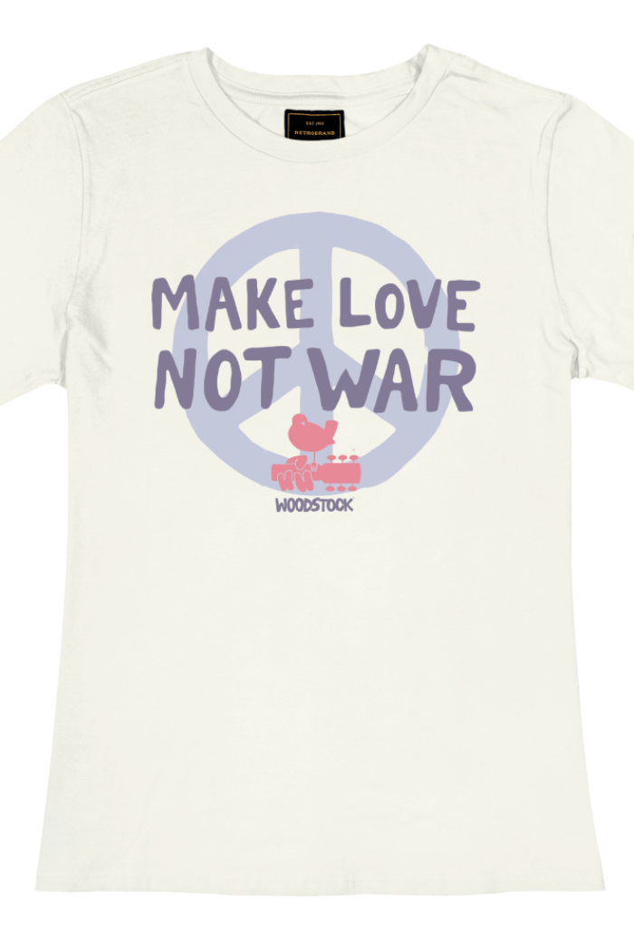 A soft short-sleeve tee printed with the classic "Make Love Not War" Woodstock graphic for a relaxed vintage-inspired look. The Woodstock Make Love Not War Short Sleeve Graphic Tee has a crew neckline and a straight, unfussy silhouette perfect for layering or wearing solo. Lightweight cotton construction and a casual fit make it ideal for everyday wear and weekend outings.
