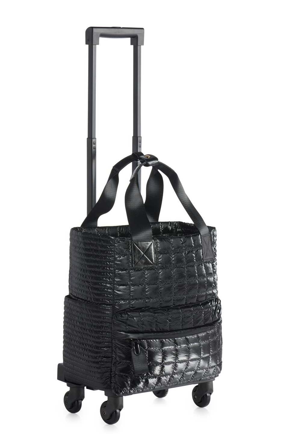 A quilted, glossy carryall designed for easy travel and everyday wear. The 360 Logan Tote Black features a telescoping handle and smooth rolling wheels for effortless mobility. Crafted bag tote in a nylon puffer silhouette with top handles and an exterior zip pocket for organized essentials. Top zip closure, 1 outer zip pocket, 2 outer slip pockets, 1 inner zip pocket, 2 inner slip pockets. The tote can be removed for the wheels to be carried on its own.