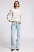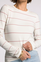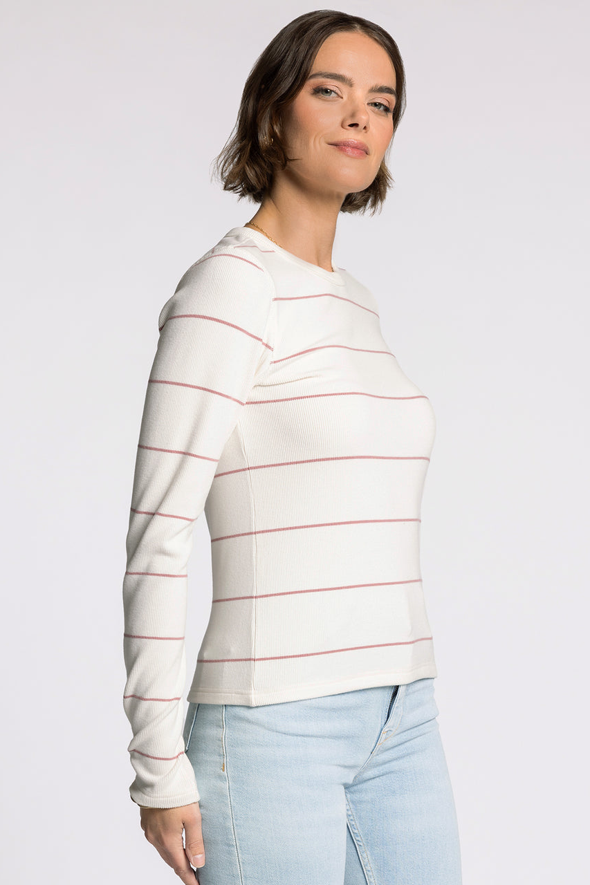 A lightweight long-sleeve crew top with subtle pink stripes and a ribbed texture. The ABRI TOP is a versatile wardrobe staple that layers easily under jackets or pairs with jeans. Its fitted silhouette and crew neckline keep the look clean and classic for everyday wear. Comfortable and casual, it’s ideal for relaxed weekends or running errands.