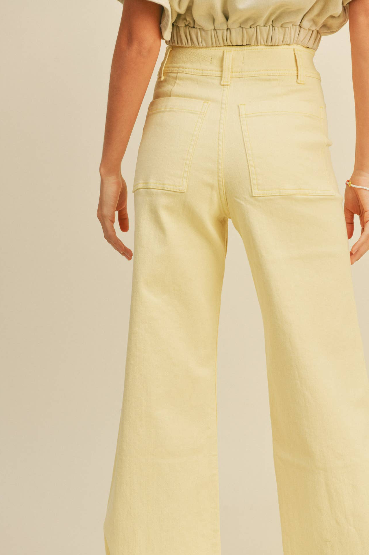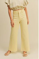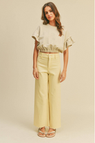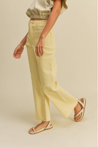 The BANANA WIDE LEG JEANS are a high-rise, wide-leg denim silhouette in a soft banana-yellow wash. These pants feature a flattering high waist and a relaxed, floor-skimming leg for an effortless, retro-inspired look. The raw hem and simple button-front closure keep the styling casual and modern. Pair them with a cropped tee or lightweight blouse for warm-weather weekends.