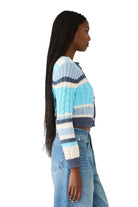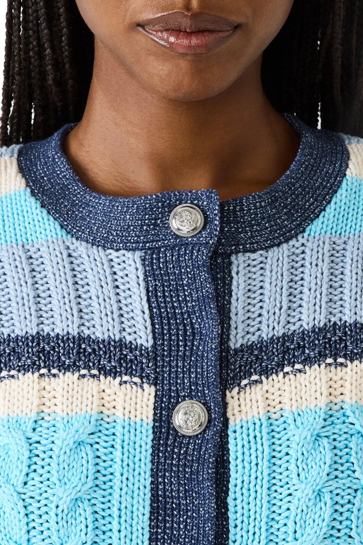 A cropped, button-front knit with cable texture and blue striped colorblocking, this Becky Sweater Cardigan adds a modern spin to a classic cardi. The cardigan features a crew neckline, long sleeves and ribbed hem for a neat, fitted silhouette. Steve Madden designed this piece in a soft sweater knit with prominent buttons for easy layering. Wear it over tees or with high-rise denim for a casual yet put-together look.