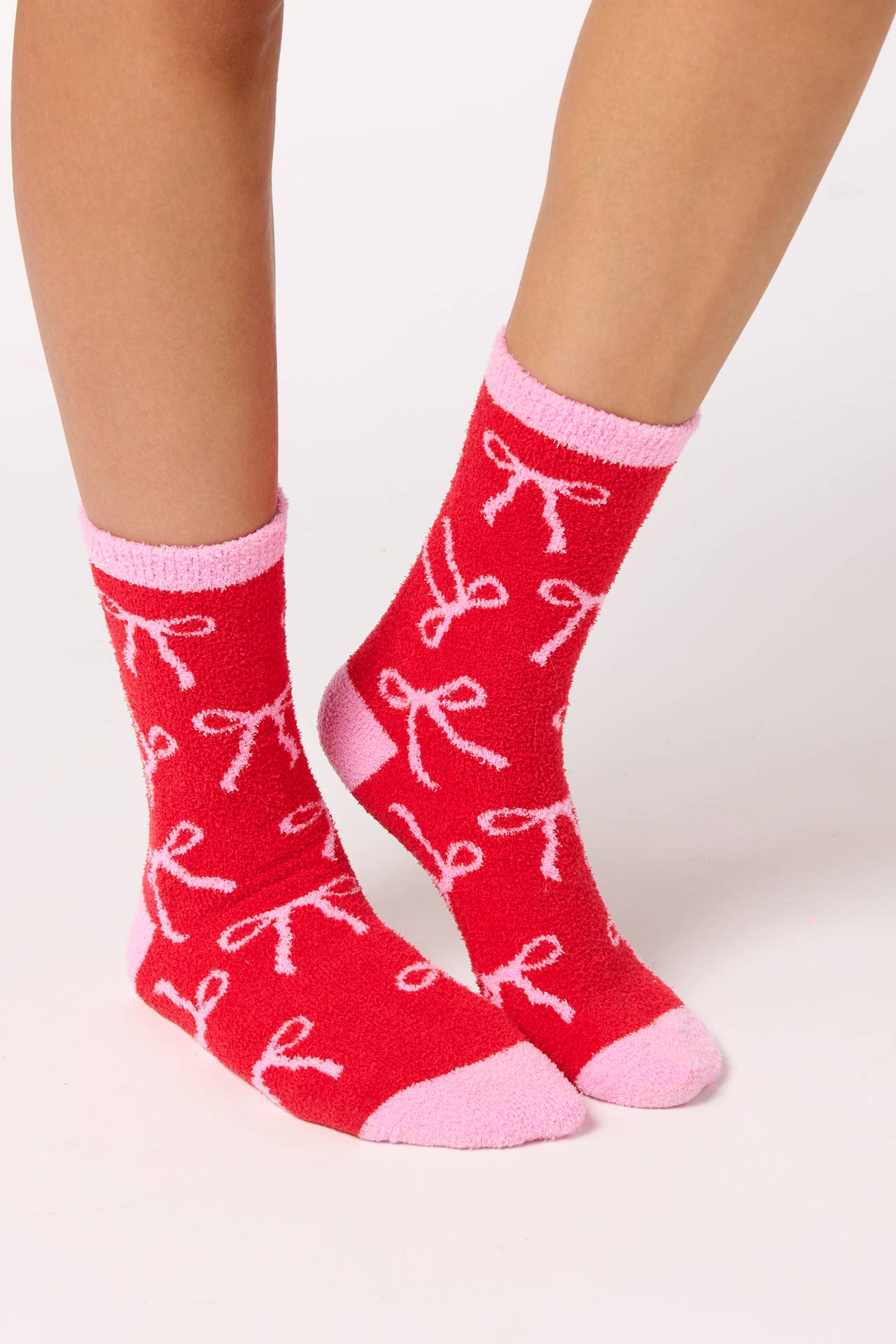 Cozy Bow Socks in red with an allover pink bow motif and contrasting pink toe and cuff. These plush, fuzzy crew socks offer a soft, insulating knit perfect for lounging or layering under boots. Designed with playful patterning and a cushioned sole for everyday comfort. These socks bring a feminine, giftable touch to this seasonal staple.