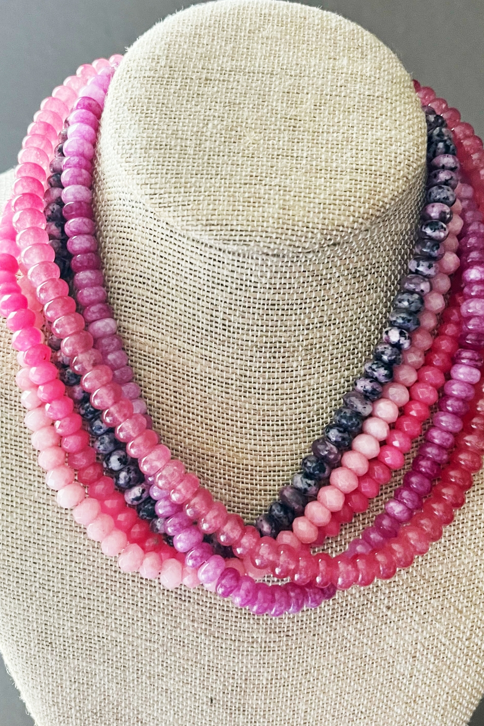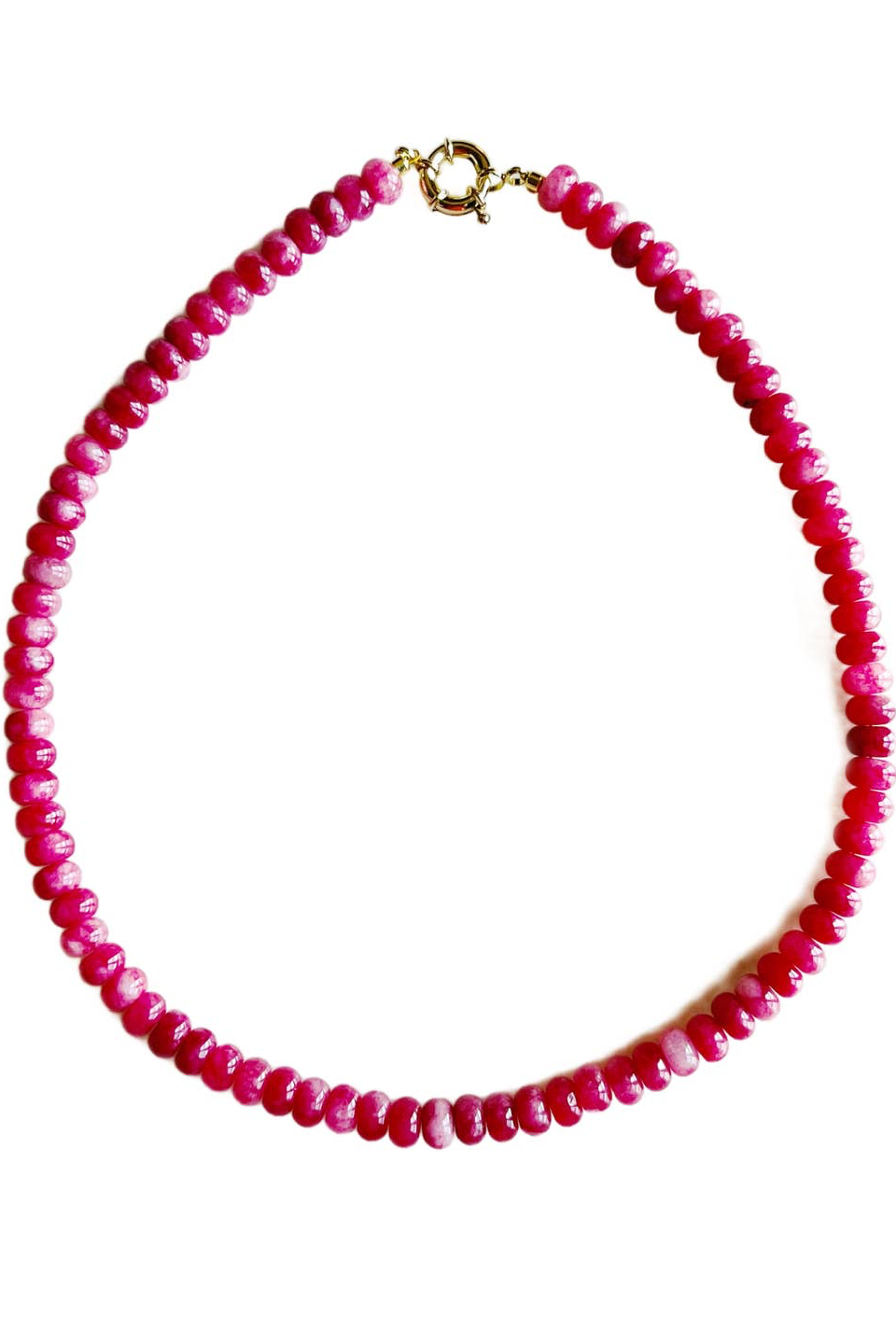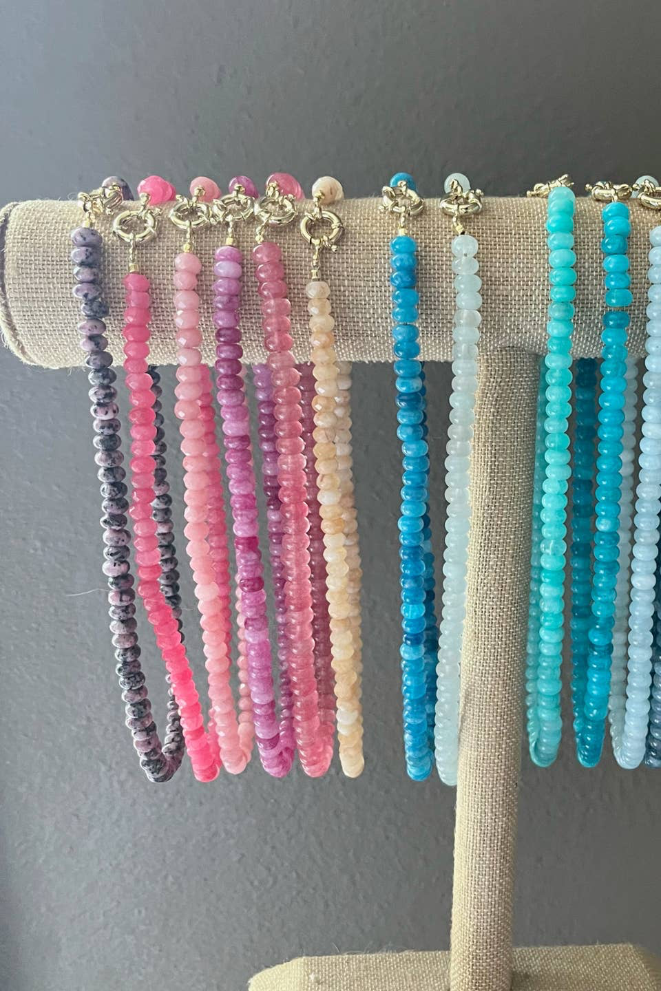 FUN POP OF COLOR TO ANY OUTFIT. EACH NECKLACE IS HANDMADE IN CHARLESTON SOUTH CAROLINA USING GEMSTONE BEADS AND 18KT GOLD PLATED CLASPS. THESE ARE PERFECT TO PAIR WITH CHARMS EITHER ON THE CLASP, OR ADD A PENDENT OR CHARM TO THE FRONT, GREAT TO LAYER WITH OTHER COLORS OF THE SAME NECKLACE! ALSO FUN TO WEAR ALONG. 17" LONG, WEIGHTS 1.8OZ