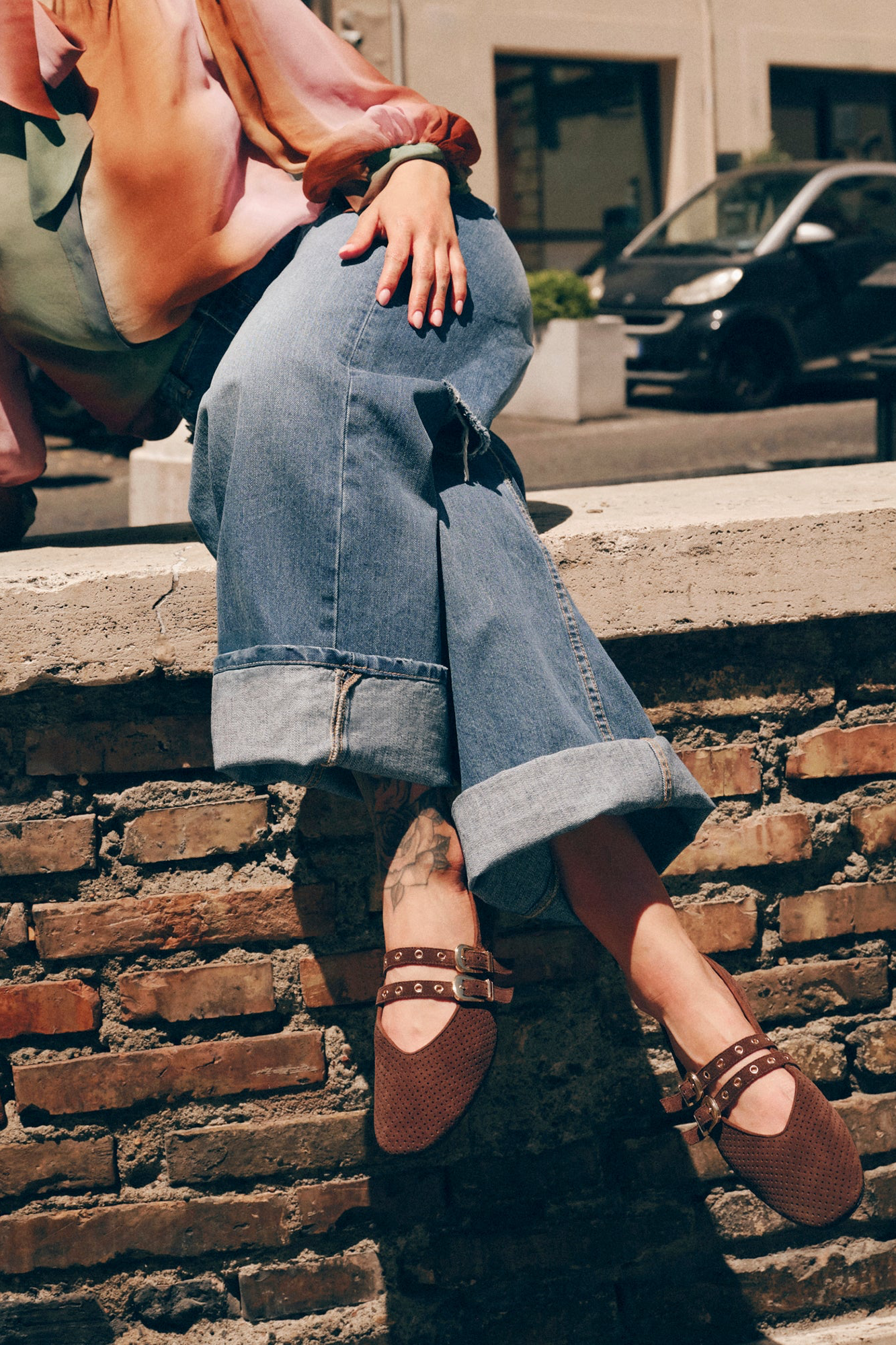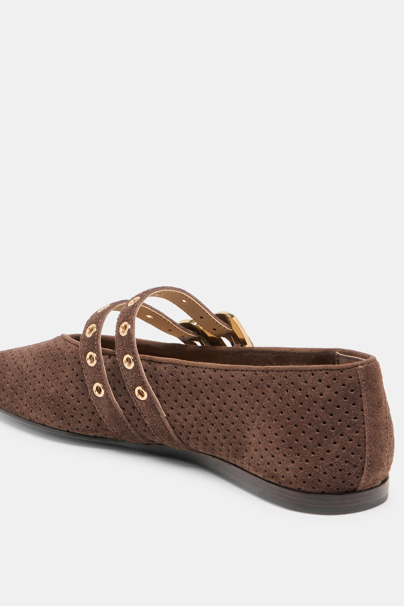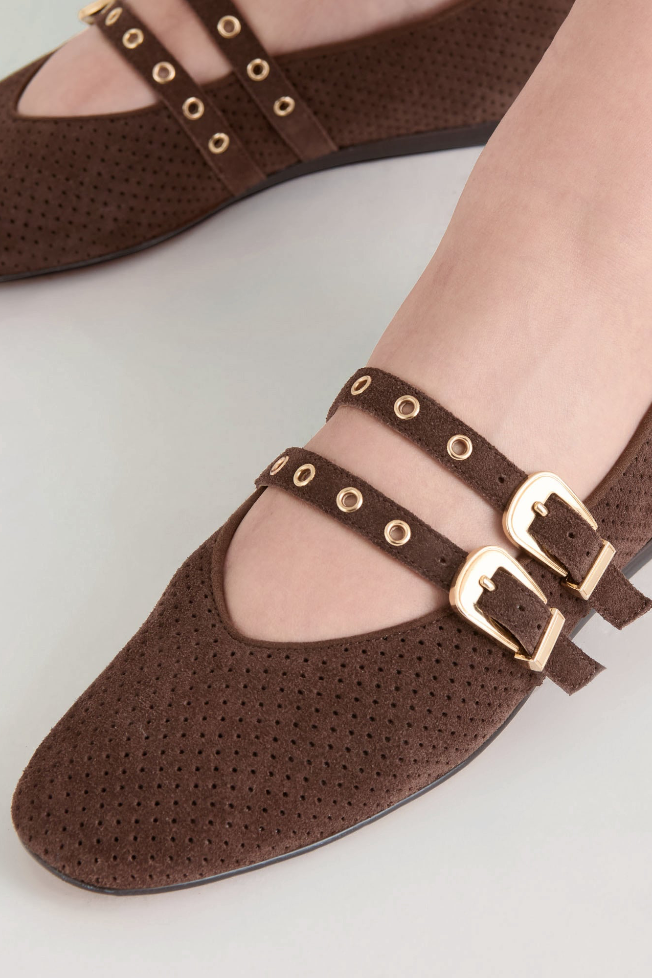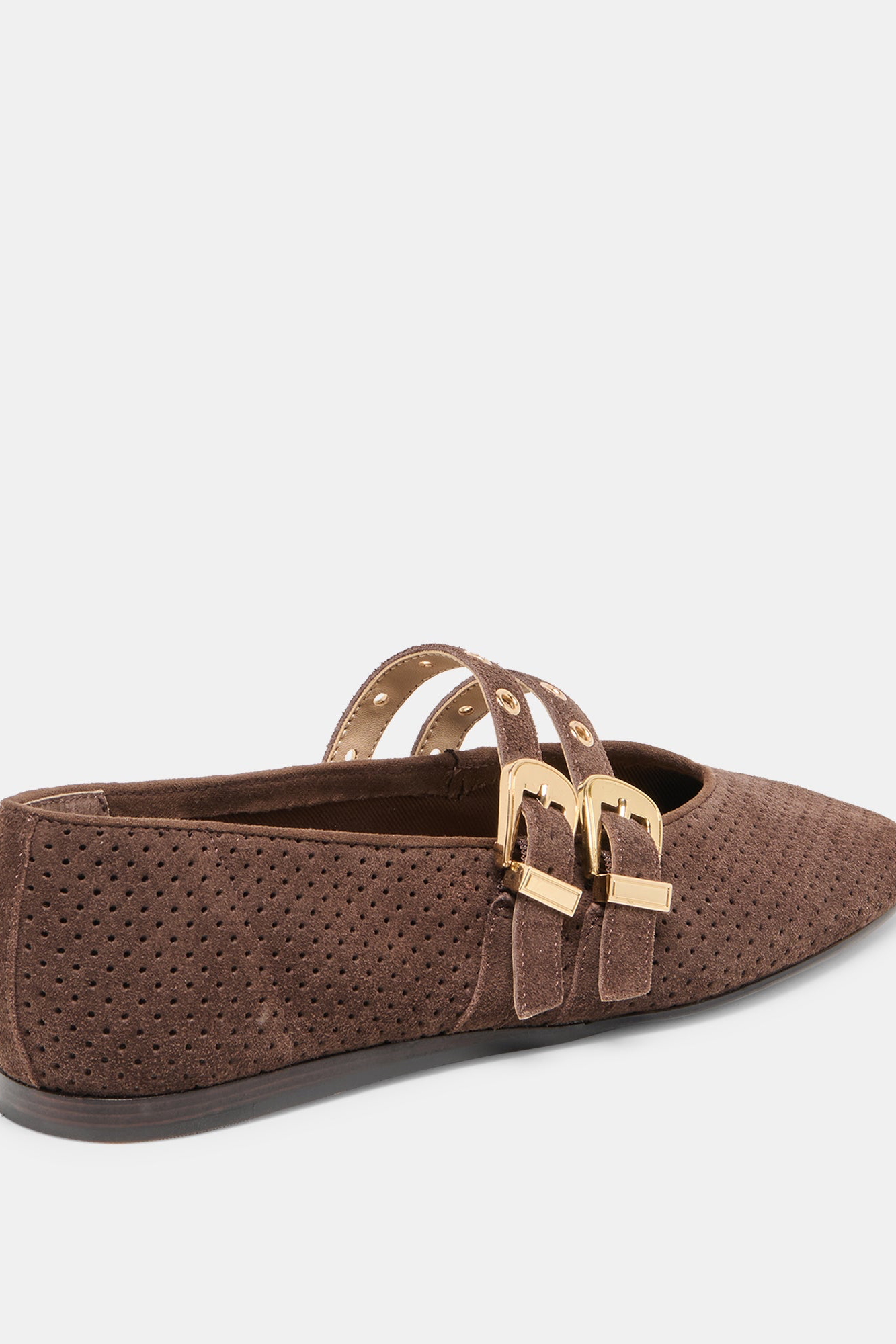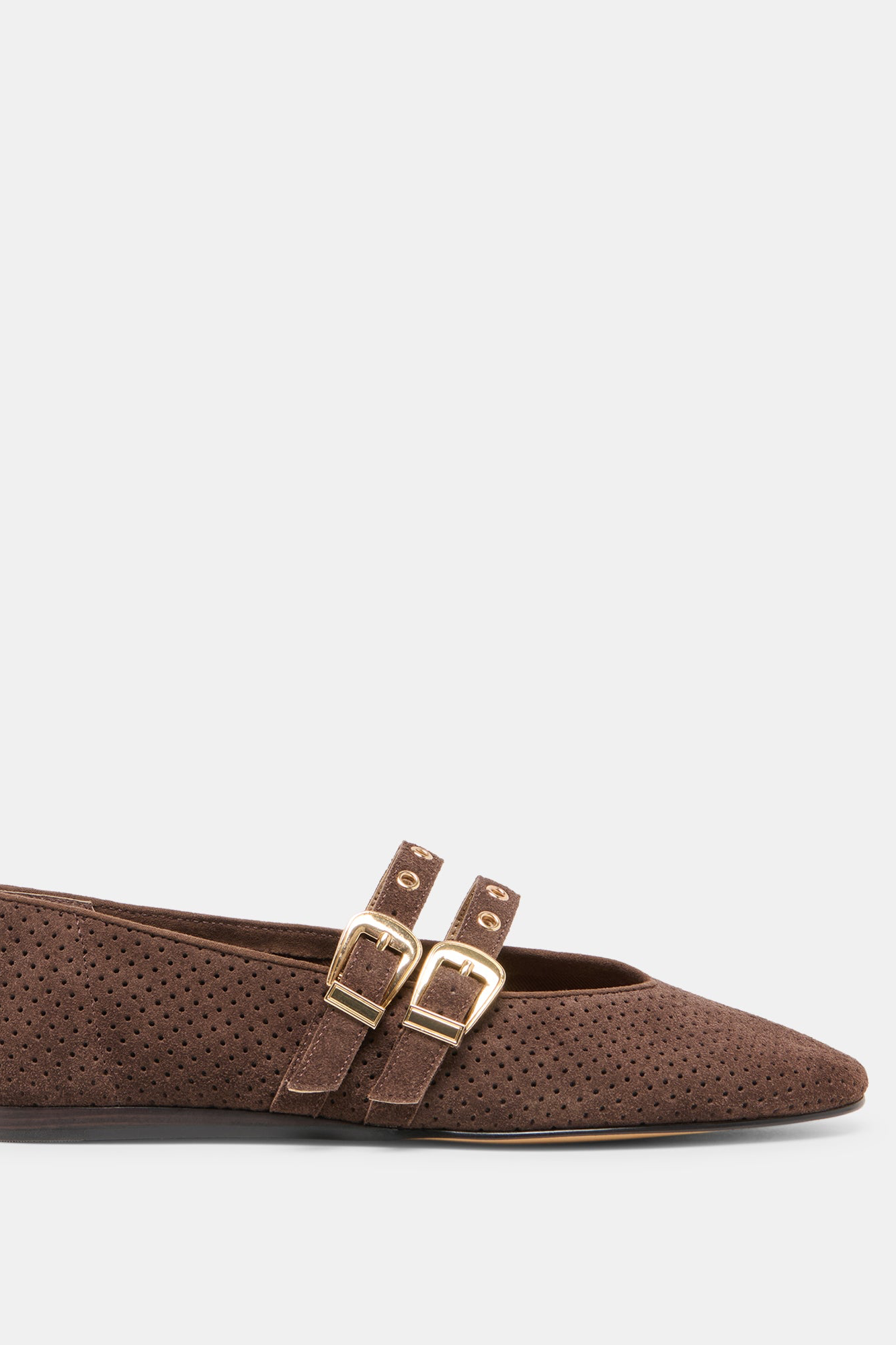 MAKE A STATEMENT WITH THESE DOUBLE STRAP MARY-JANE DESIGN WITH GOLD METAL GROMMETS AND BOLD BUCKLES. THIS SUSTAINABLY-CRAFTED FLAT BOASTS SUSTAINABLE MATERIALS IN BROWN PERFORATED SUEDE FOR ONE ON-TREND AND VERSATILE BALLET FLAT.