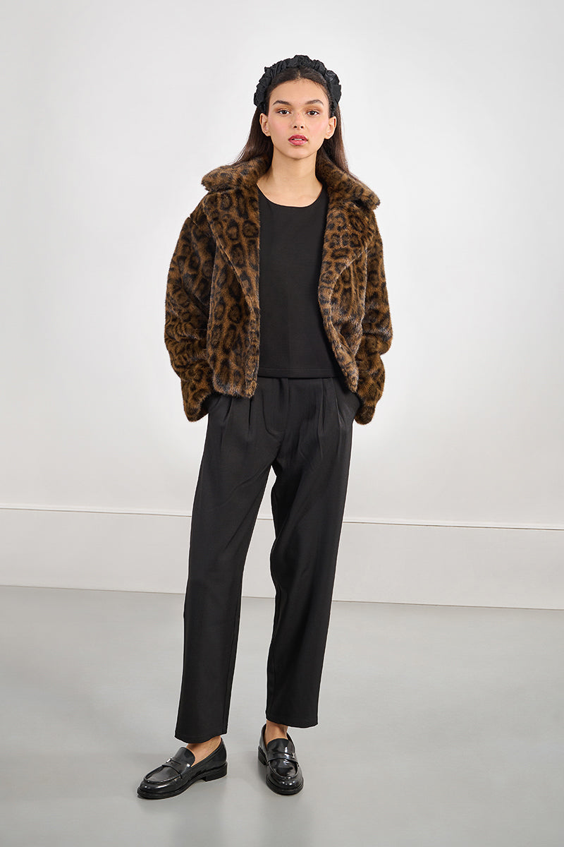 WHAT A CLASSY LOOK TO ADD TO YOUR WARD WROB! LEOPARD FAUX FUR JACKET, LONG SLEEVES, WIDE SHAWL COLLAR WITH A SHORT AND WIDE FIT. FULLY LINED. HAS SNAP BUTTON CLOSURE ON THE MIDDLE FRONT.