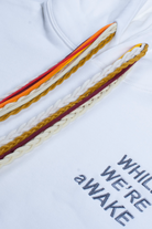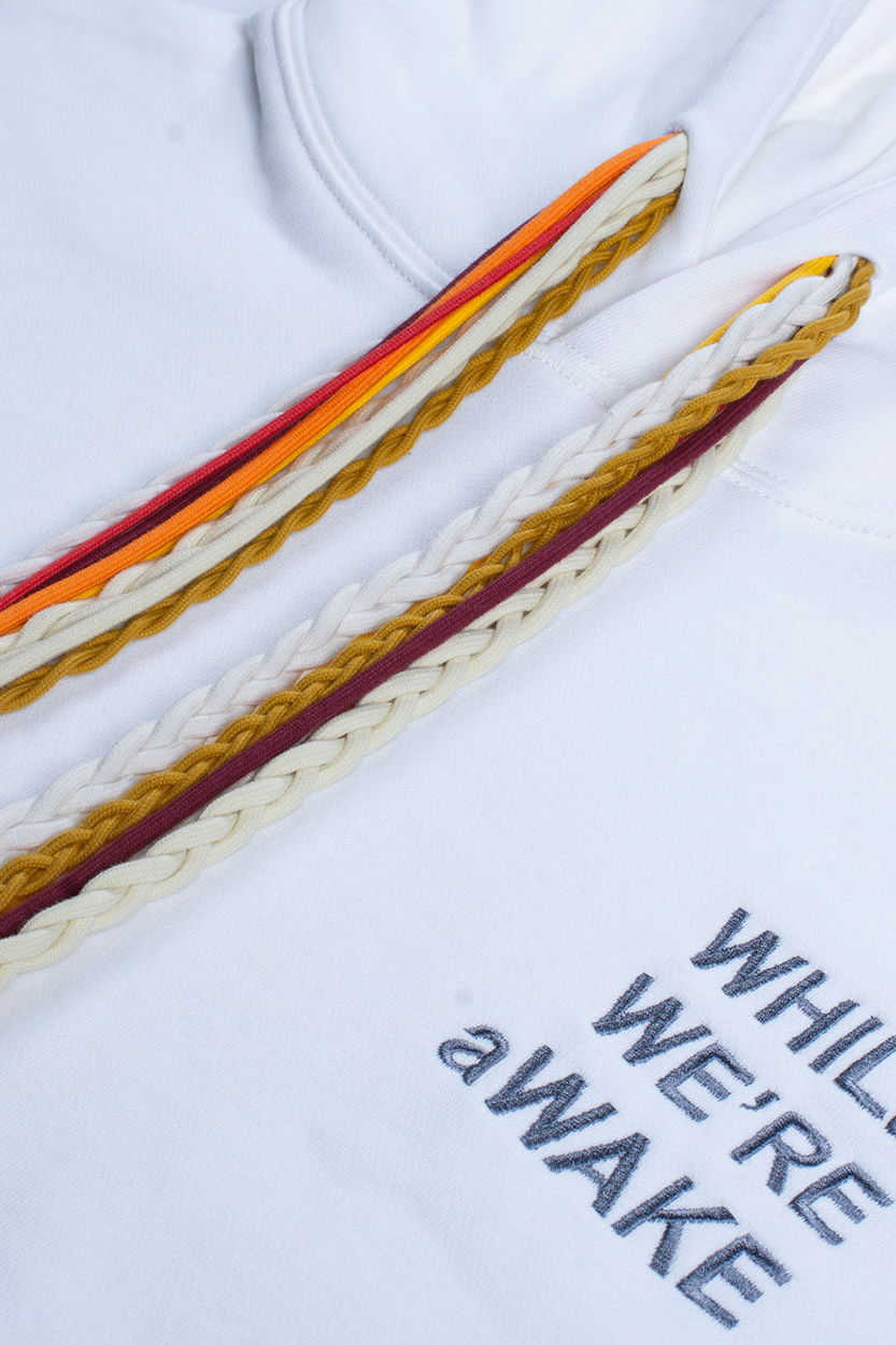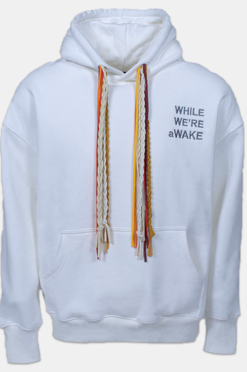 THIS PERFECT WHITE HOODIE IS MADE OF 100% COTTON FOR A HIGH-QUALITY GARMENT AND COMFORTABLE FIT. FEATURES A RIBBED COTTON HEM AND CUFFS WITH MULTI COLOR STRING DETAIL AND " WHILE WE'RE aWAKE" LOGO ON THE CHEST.