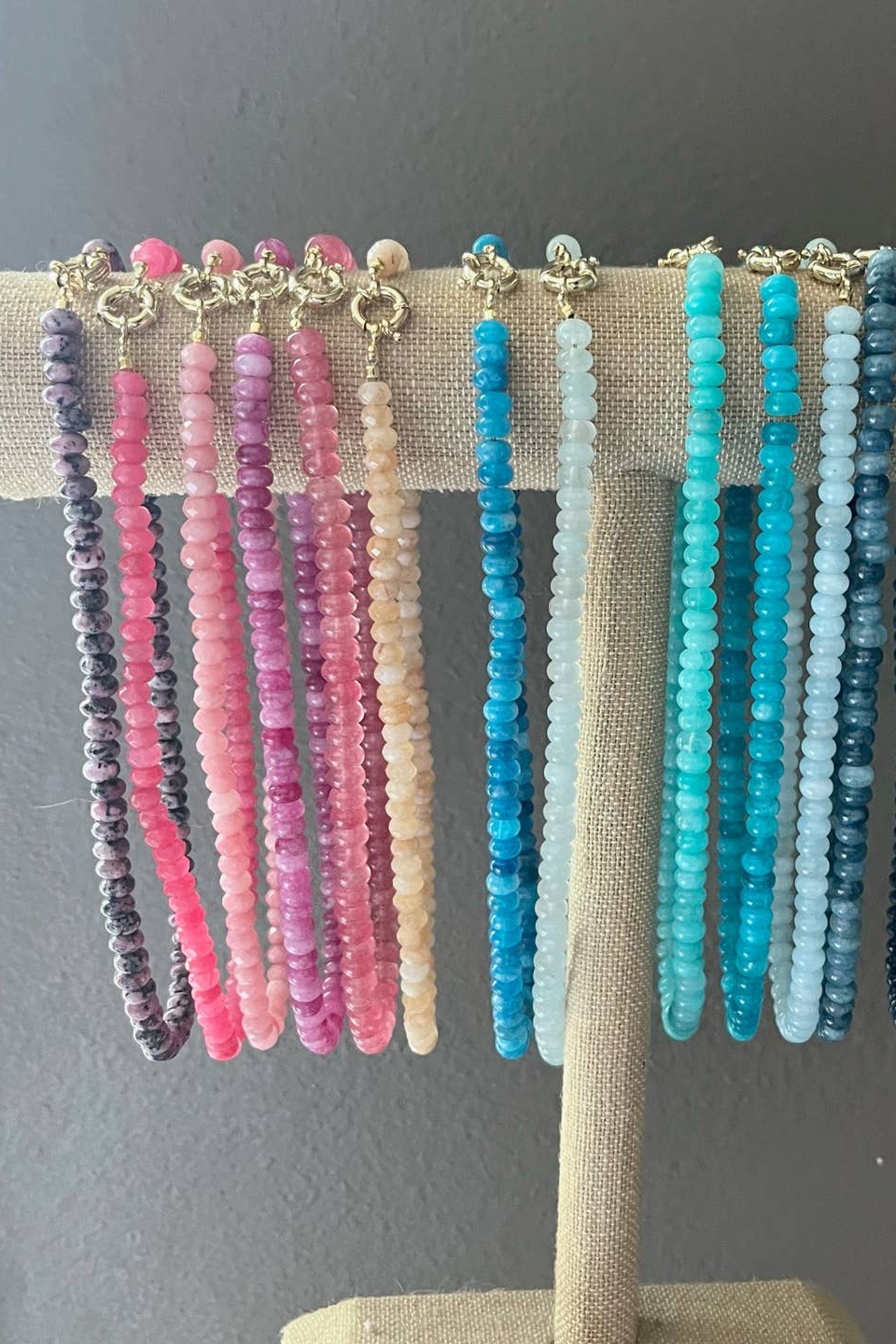 ADD A POP OF COLOR TO ANY NECKLACE. HANDMADE IN SOUTH CAROLINA, USING GEMSTONE BEADS AND 18KT GOLD PLATED CLASP. PERFECT TO PAIR WITH A CHARM ON THE CLASP, OR ADD A PENDENT, OR CHARM TO THE FRONT, WEAR LAYERED OR ALONE.