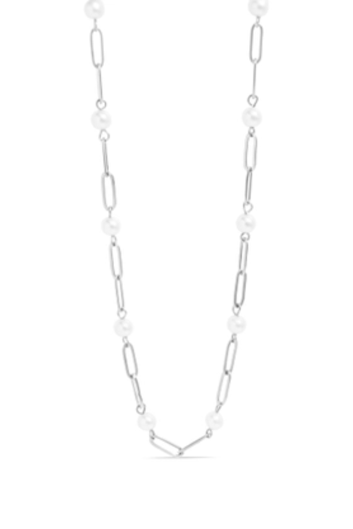 THIS PAPERCLIP CHAIN NECKLACE IS SURE TO BECOME YOUR NEW EVERYDAY PIECE. FEATURING A PAPERCLIP CHAIN DESIGN, THIS NECKLACE IS PUNCTUATED WITH SAPRKLING GLASS PEARL STATION THAT CREATE A BALANCED AND ELEGANT AESTHETIC. CRAFTED FROM HIGH QUALITY STAINLESS STEEL, IT OFFERS BOTH DURABILITY AND BRILLIANT, TARNISH RESISTANT FINISH. NECKLACE IS WATERPROOF, NON-TARNISH, HYPOALLERGENIC.