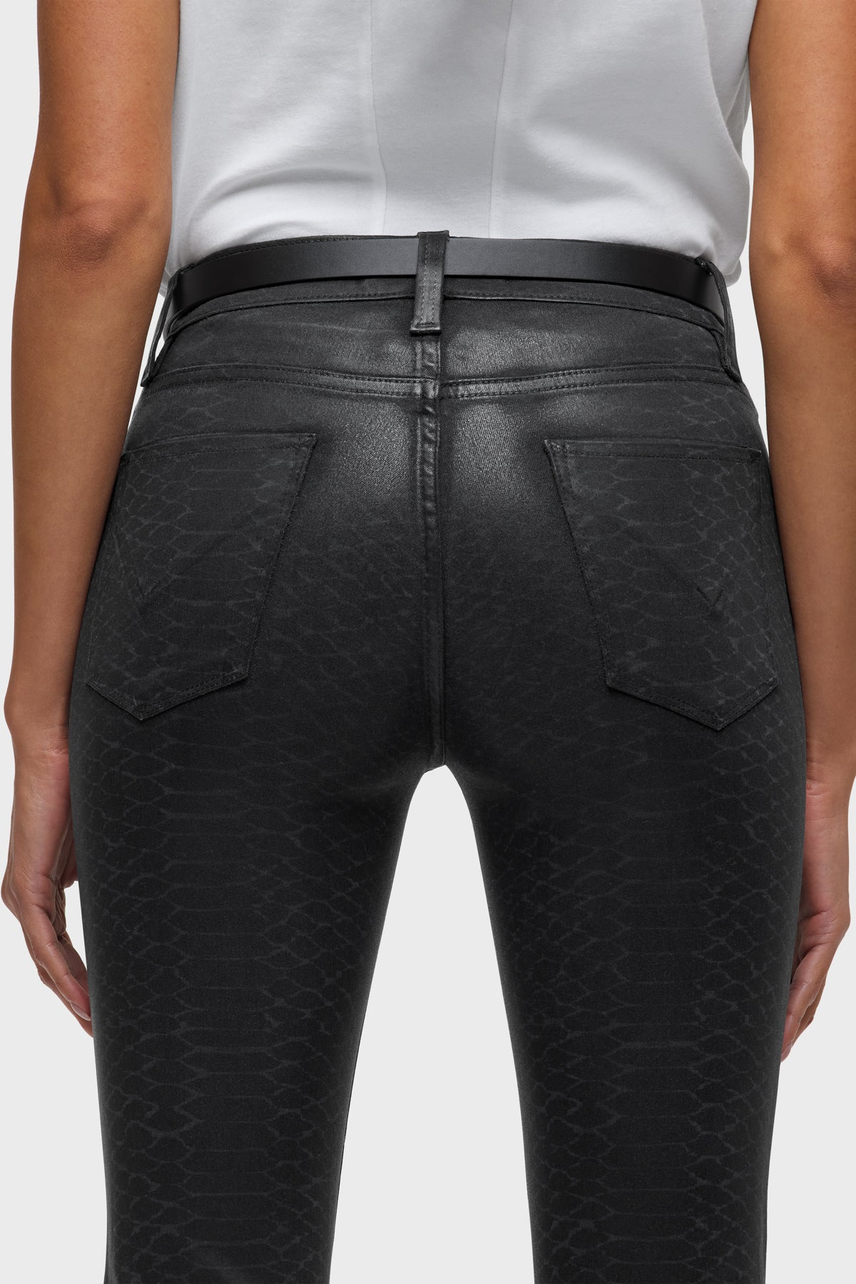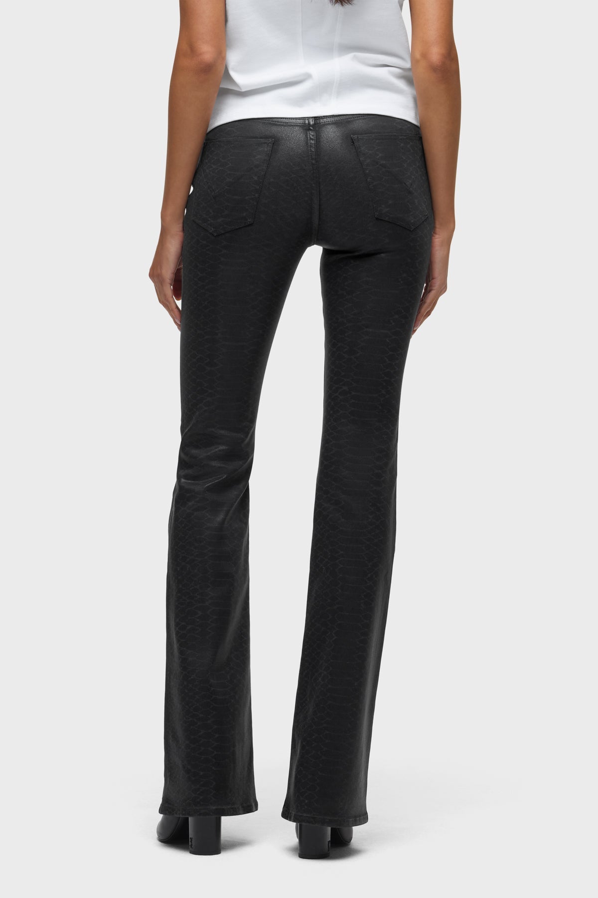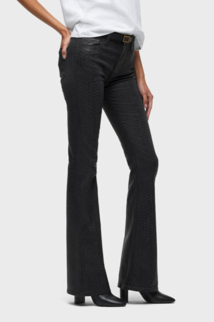 THESE PANTS ARE A SHOW STOPPER. STREAMLINED AND FLATTERING, THESE BOOTCUT PANTS HAVE A SLIM CONTOURED FIT WITH AN ELEVATED WAISTLINE AND GENTLY FLARED LEG. MADE WITH A SNAKE COATED PRINT ON A CLACK BASE FOR A SUBTLE STATEMENT, THESE PANTS ARE FINISHED WITH A 34.5" INSEAM AND CLEAN FINISHED HEM.